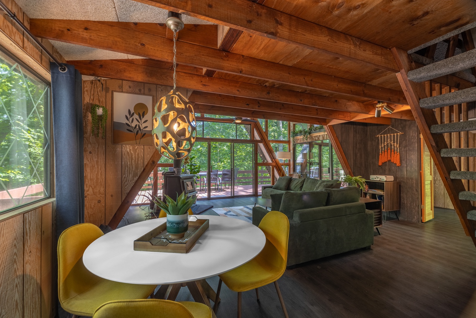 Building the chalet out of the organic curves of the land gave the designers an opportunity to refine the layout to blend in with its wooded natural surroundings. One bedroom on the main level provides easy access to the full bath, while the loft boasts two trundle-style twin beds and one queen bed. The luxury kitchen compliments the vintage vibe of the open living area, furnished with custom cabinetry, updated tile flooring, and large amounts of countertop space. And did we mention yard games?! This chalet is stacked full of outdoor games including corn hole, jumbo jenga, and more!