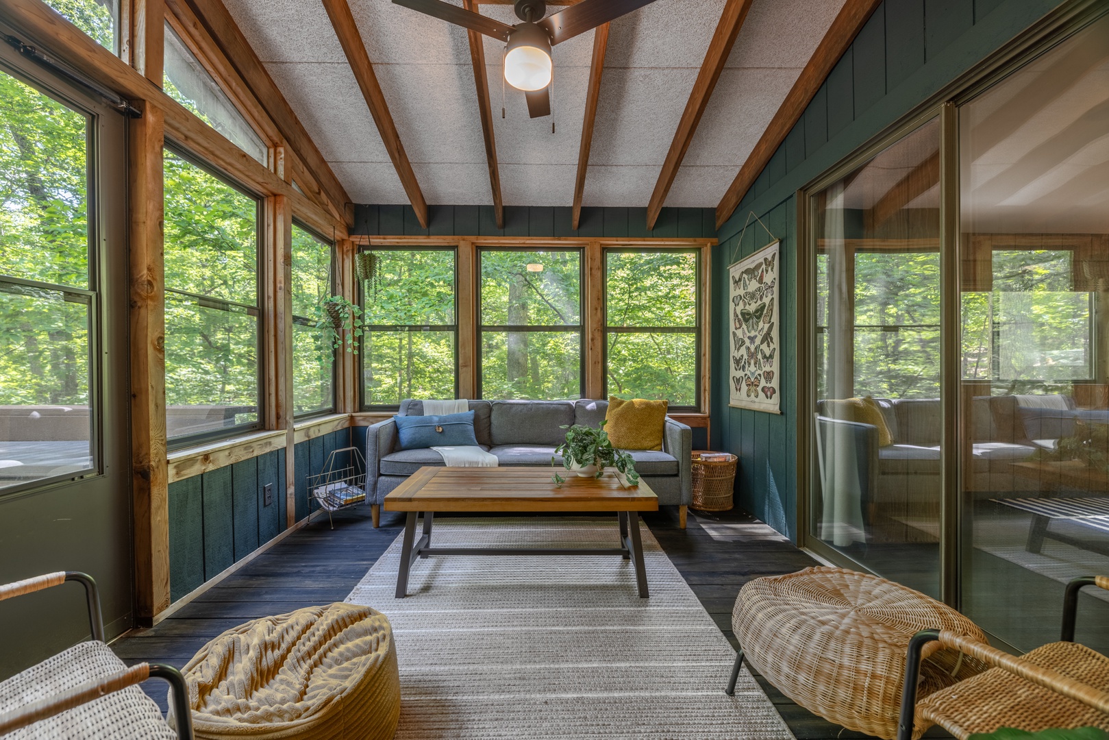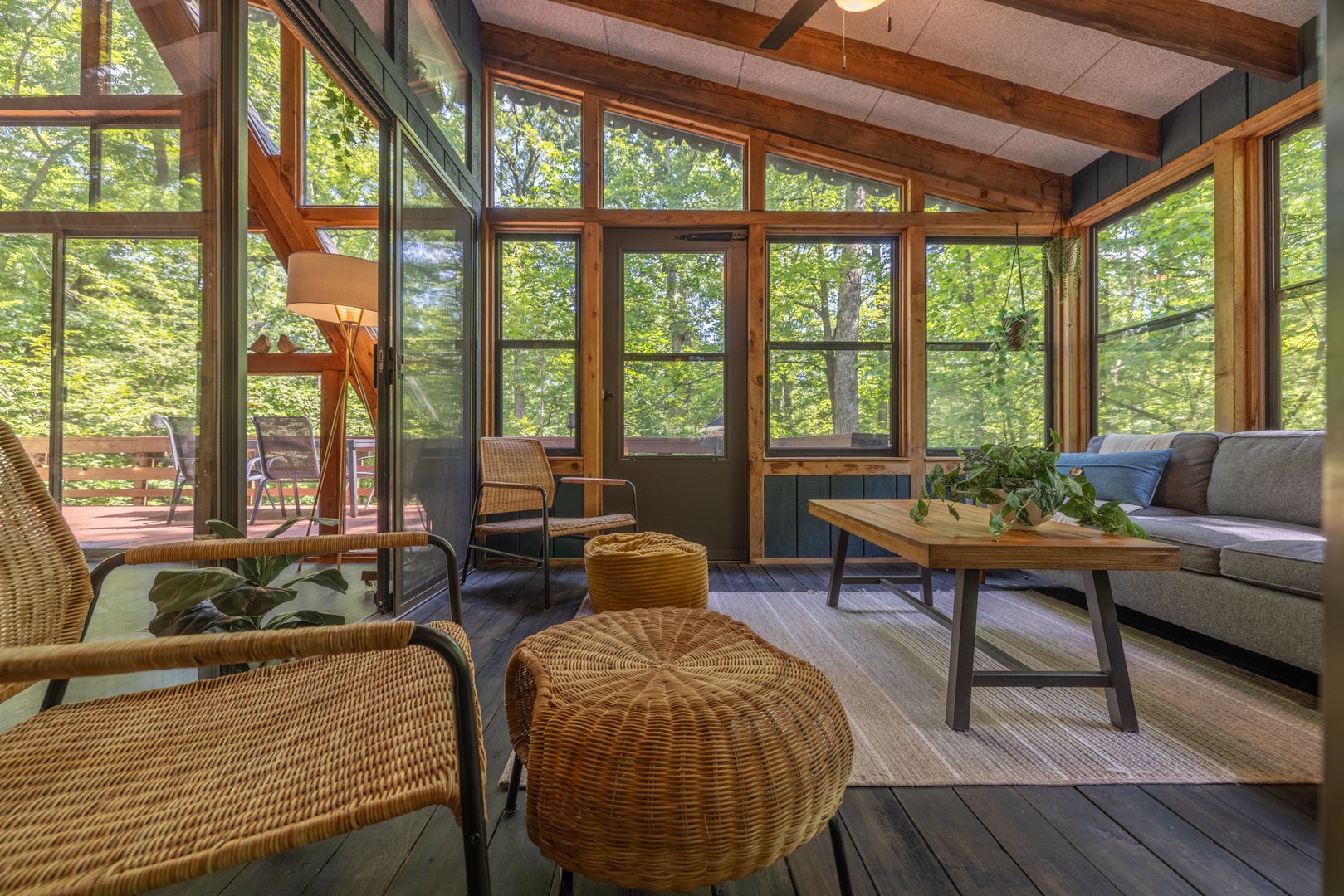 • Screened-in porch with cozy furniture and access to the back deck