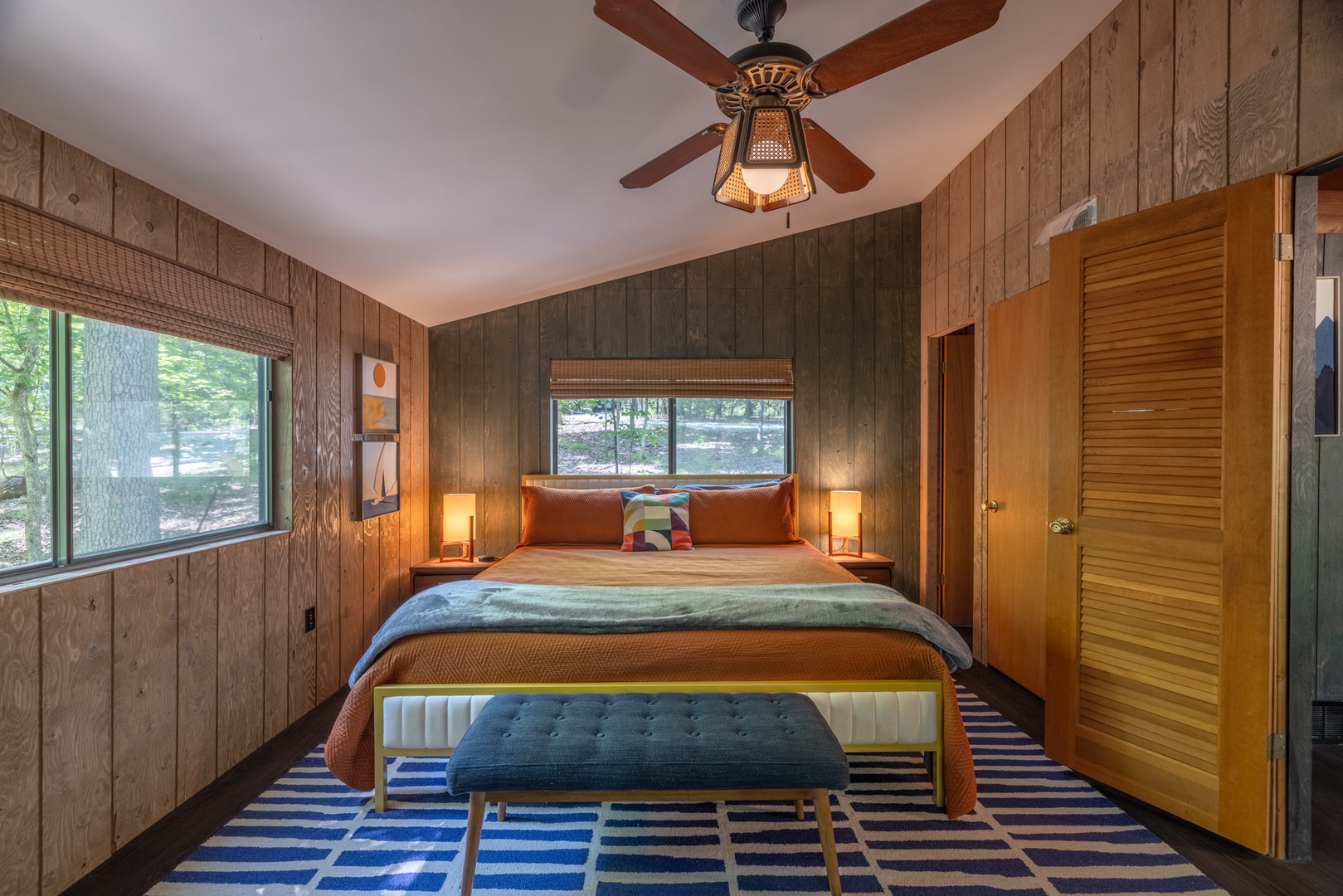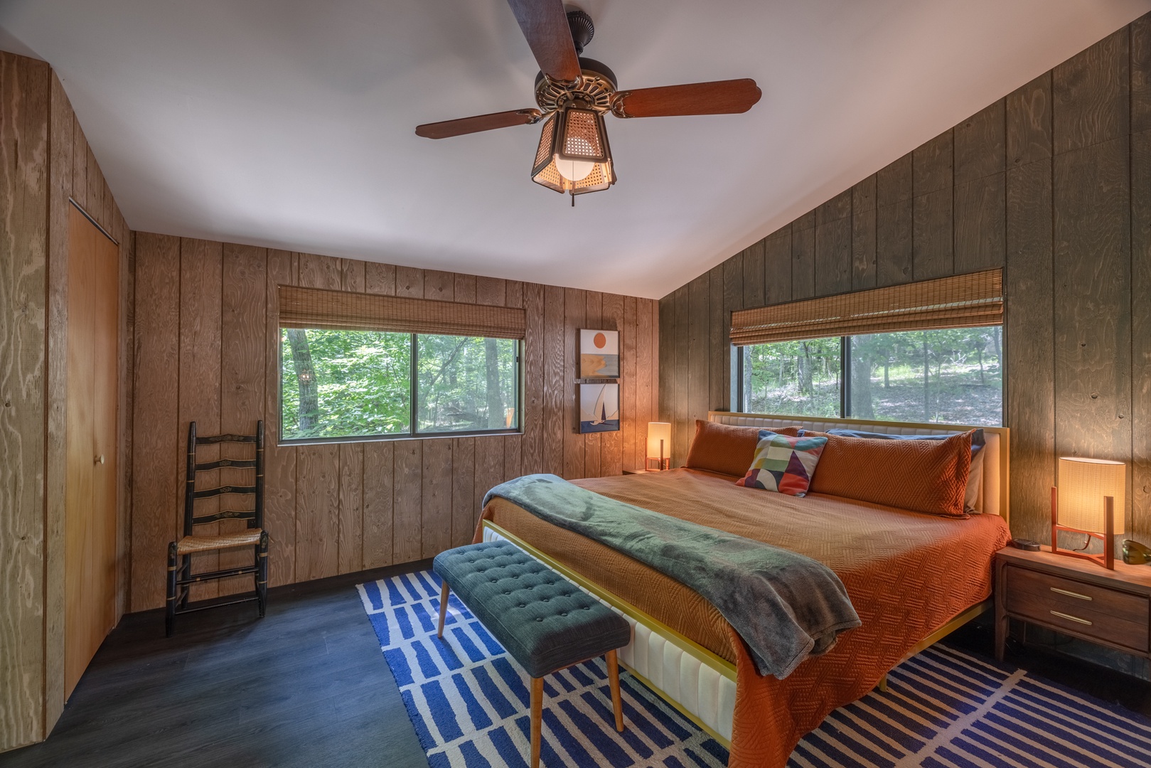 • Private primary bedroom on the main level with one king bed, sliding glass doors to the screened-in porch, and easy access to the full bath on the main level