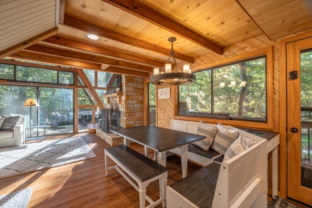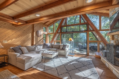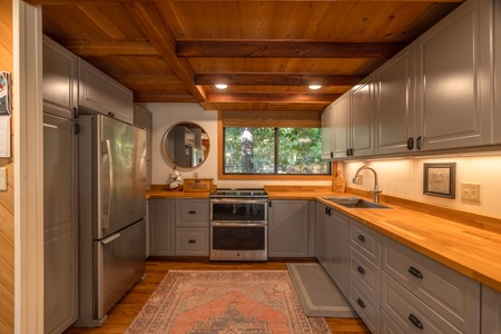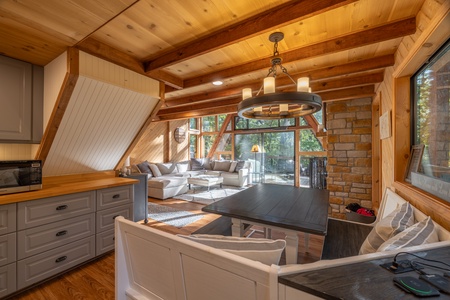 Inside, you’ll be welcomed by an open floorplan filled with natural light, a stone wall wood-burning fireplace, and cozy yet elegant décor. The roomy living area features plush seating, a smart TV for streaming your favorites, and sliding glass doors that open to the expansive back deck. The fully equipped spacious kitchen has everything you need to create gourmet meals, with a separate dining area perfect for lingering over dinner and conversation.