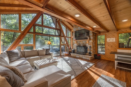 • Roomy living area with a stone wall wood-burning fireplace, cozy furniture, smart TV, and sliding glass doors to the back deck