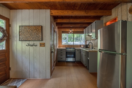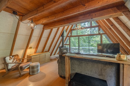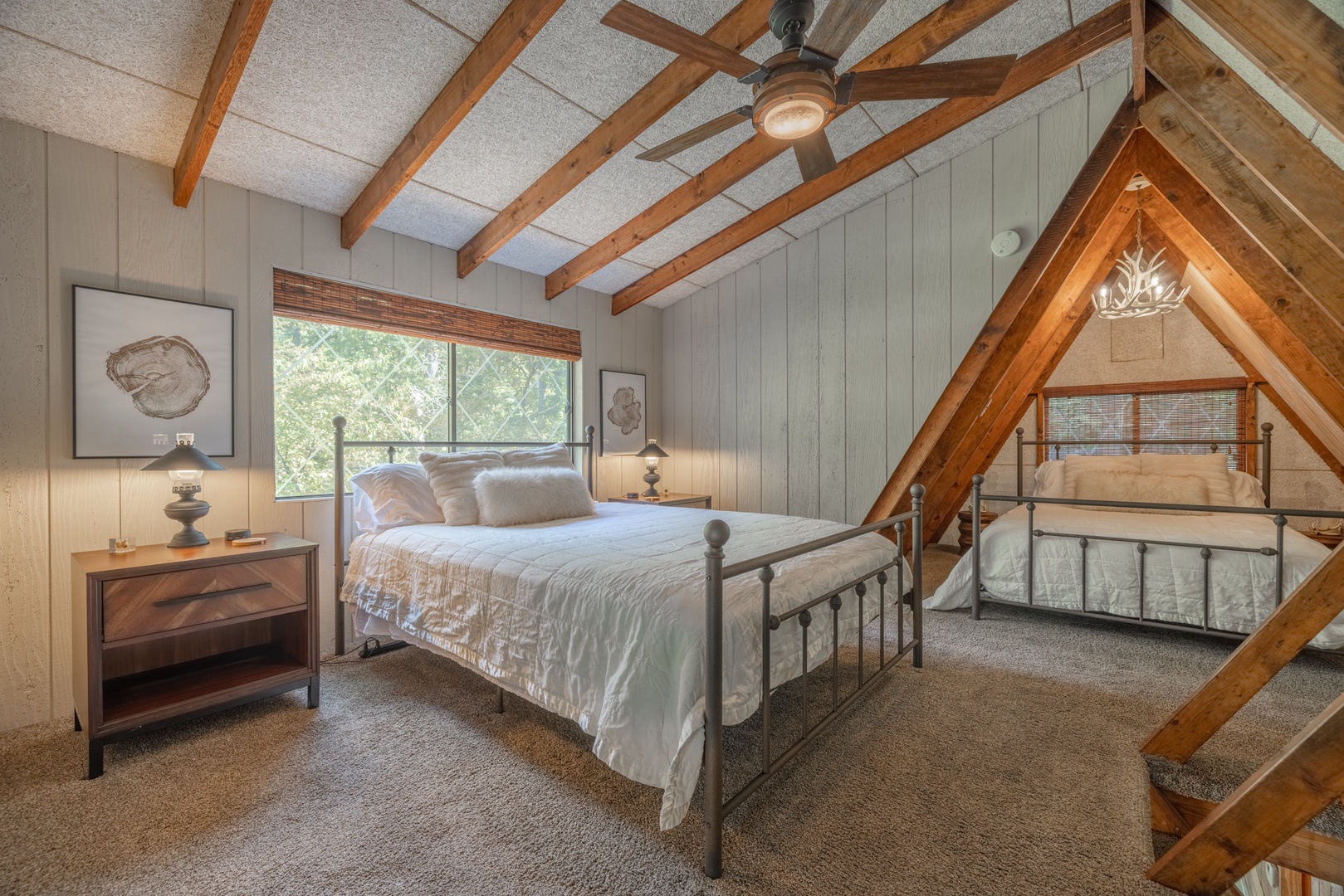 Perfect for couples, small families, or friends, Raven Ridge comfortably sleeps up to 4 adults and features an open-concept layout with a vaulted ceiling and loft-style bedroom overlooking the living area. Upstairs, you’ll find one queen bed and one full bed, creating a warm and restful space to unwind after a day of adventure. A pack ’n play is also available for guests traveling with little ones.