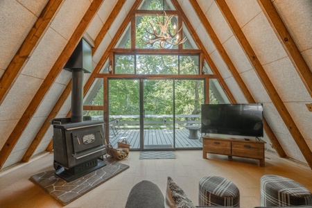 • Cozy living room with wood-burning stove, smart TV, and comfortable seating