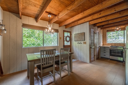 The living room offers a cozy gathering spot with a wood-burning stove, comfortable seating, and a smart TV — ideal for curling up on cool evenings. The equipped kitchen makes preparing meals easy, while the dining area provides a charming place to share them together. Every detail, from the rustic wood finishes to the thoughtful modern touches, enhances the chalet’s inviting, homey atmosphere.