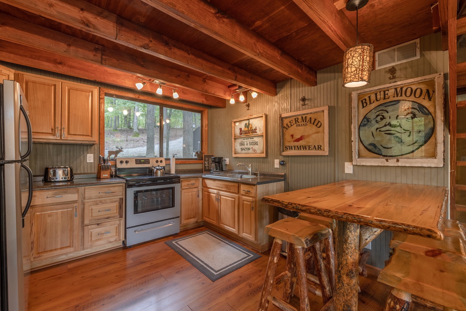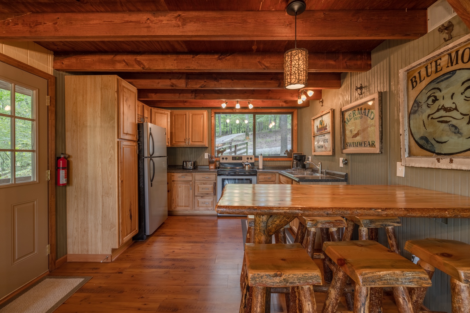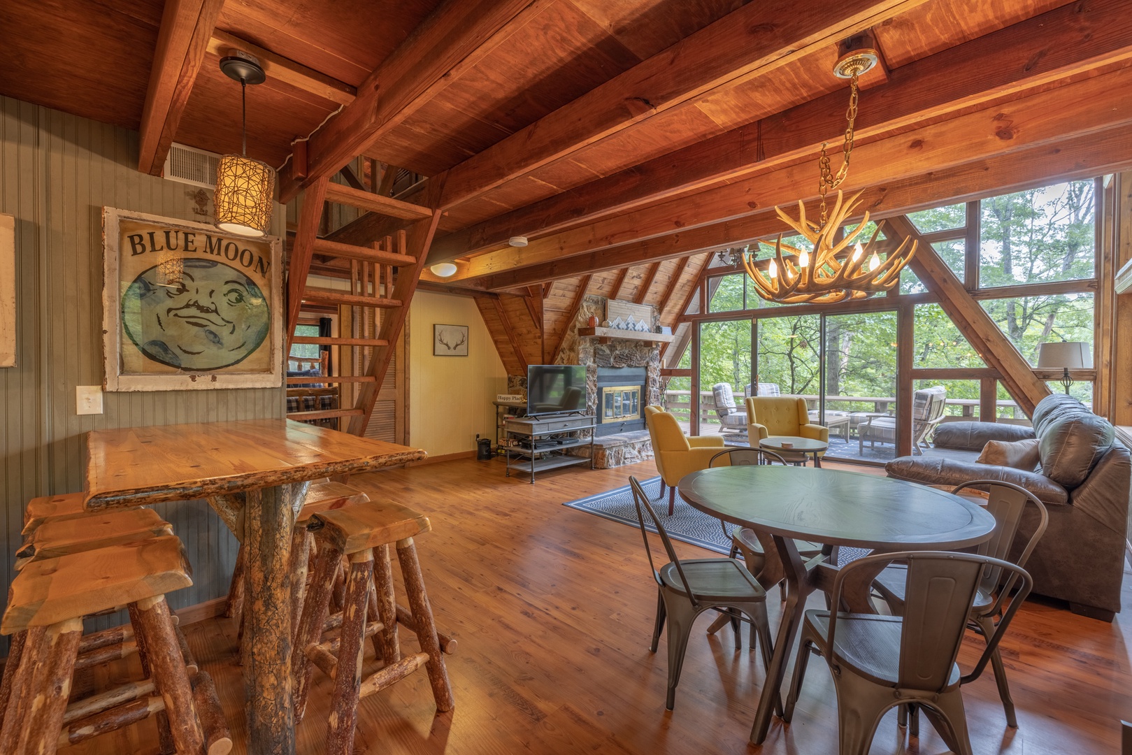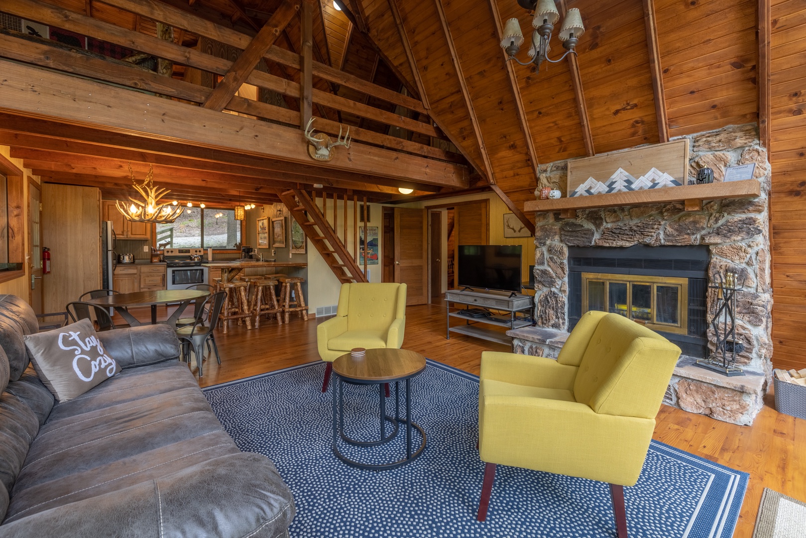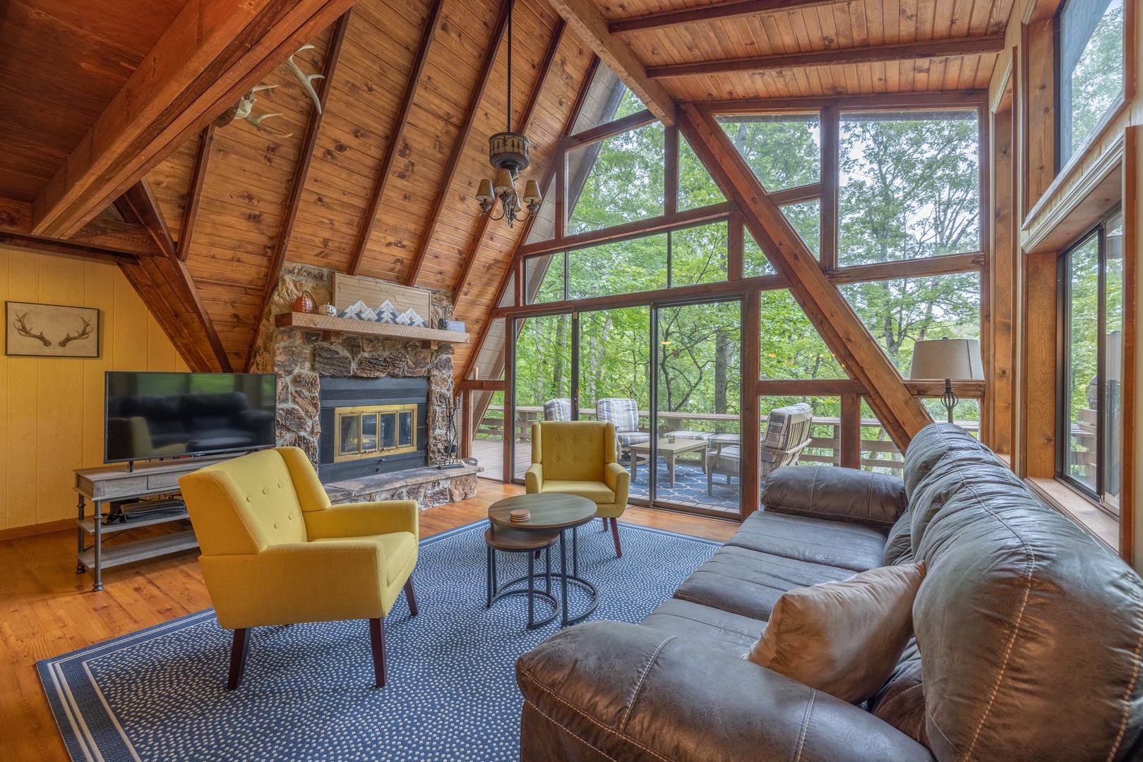 This chalet comfortably accommodates up to 8 guests with two bedrooms and two bathrooms. The unique a-frame structure is outfitted with vaulted ceilings and a wall of floor to ceiling windows providing stunning views of the outdoors throughout the home. The open floorplan features a spacious living area with a wood-burning fireplace, over-sized furniture, dining area, and sliding glass doors leading out to the expansive deck. No need to pack cooking utensils, as our kitchen is fully equipped and ready with everything you need for breakfast, lunch, and dinner.