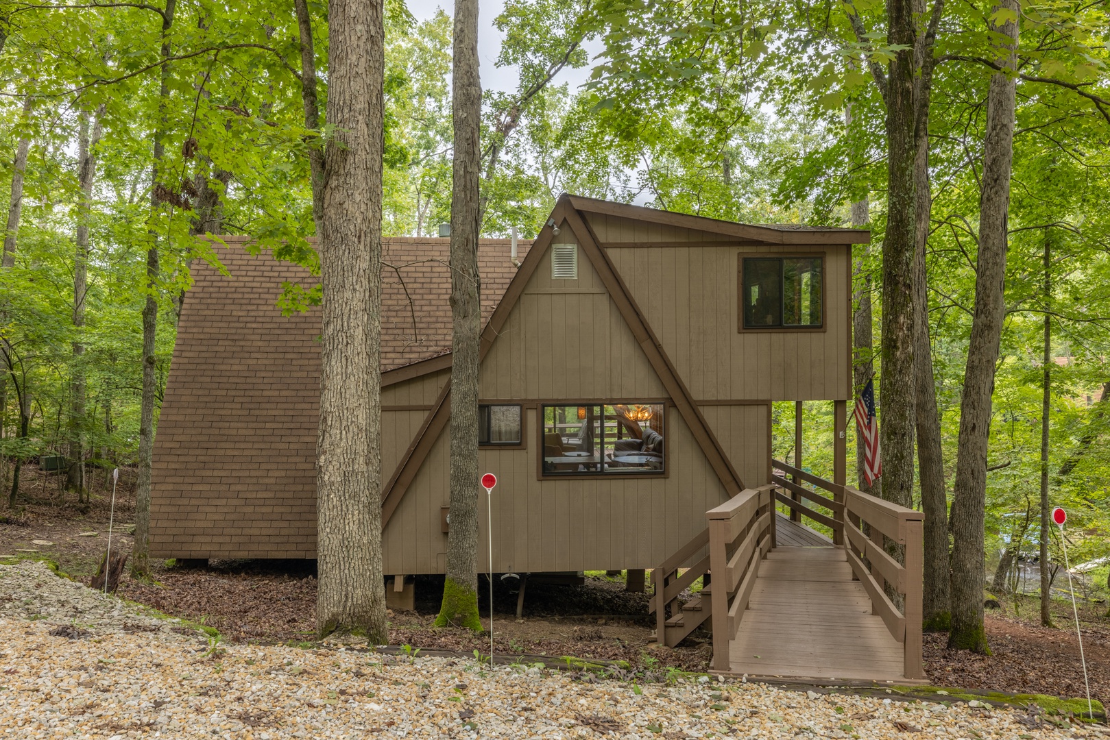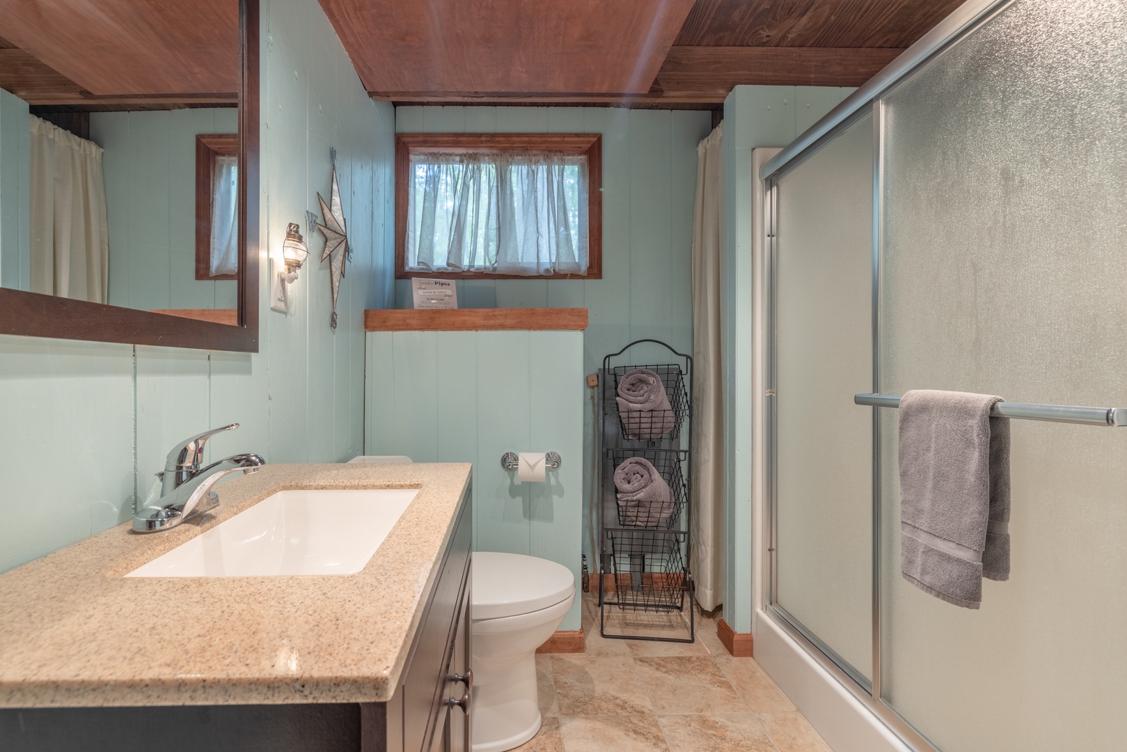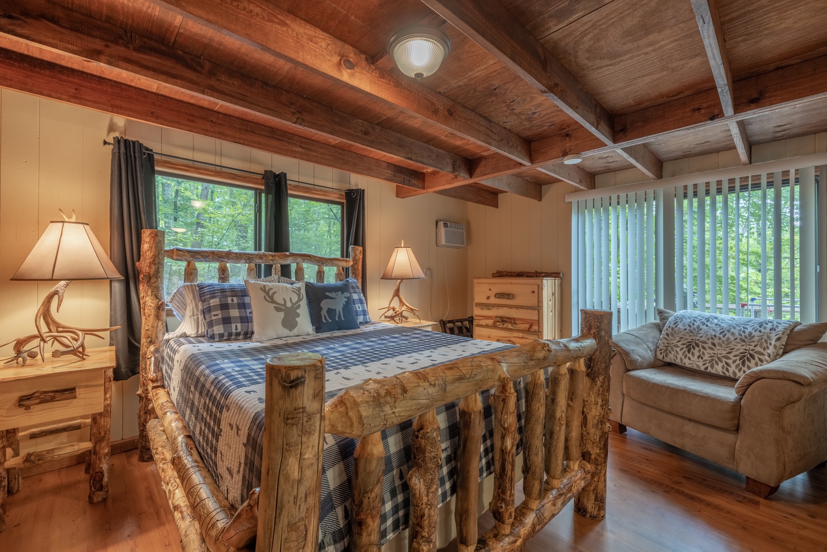 • Private primary bedroom on the main level with one queen-sized bed, sliding glass doors to the deck, and easy access to the full bath