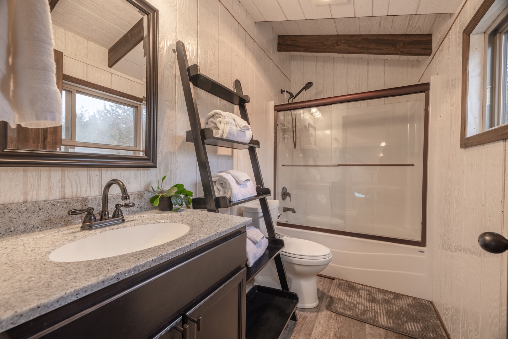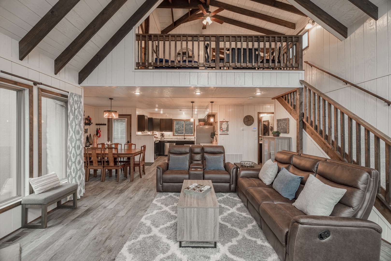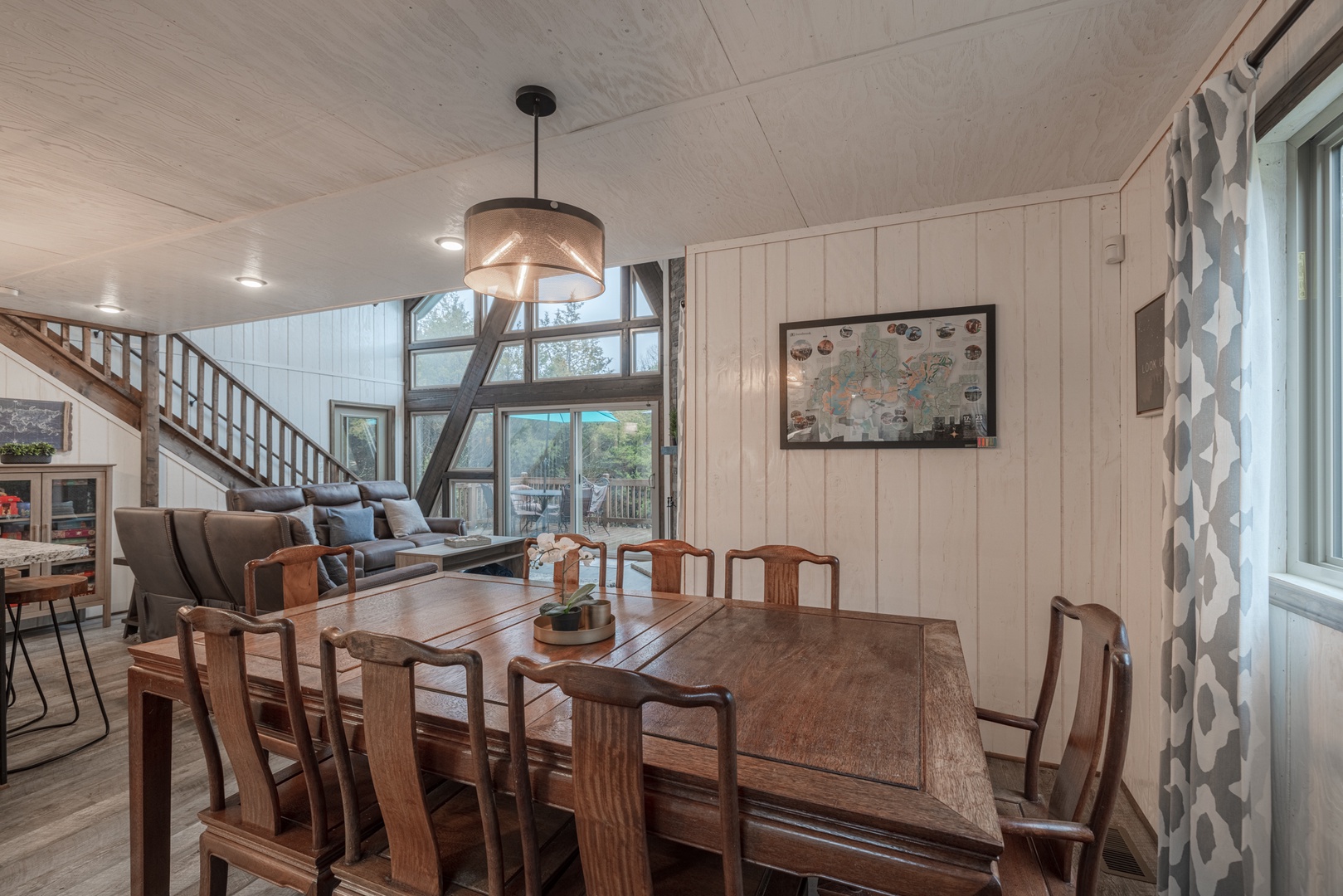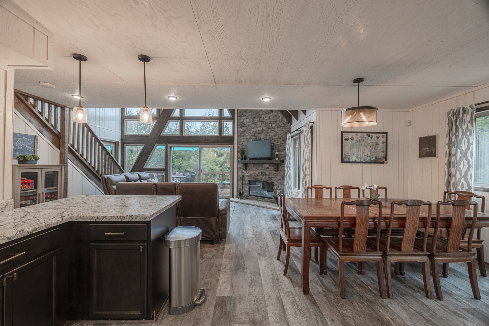 As you step through the front door, you and your guests are greeted by an open floor plan adorned with rustic finishes and natural light seeping through the expansive wall of floor-to-ceiling windows. The main level living area features a stone wall fireplace, new couches and recliners, TV, and impeccable views at every angle. Just off of the living area is the fully equipped kitchen outfitted with custom countertops, a breakfast/coffee bar, an air fryer, and stocked with a variety of tools and basic ingredients for your convenience. A dedicated home office nook with high-speed internet and USB ports makes remote work or study easy and efficient.