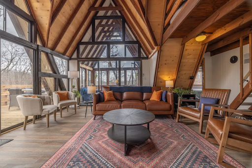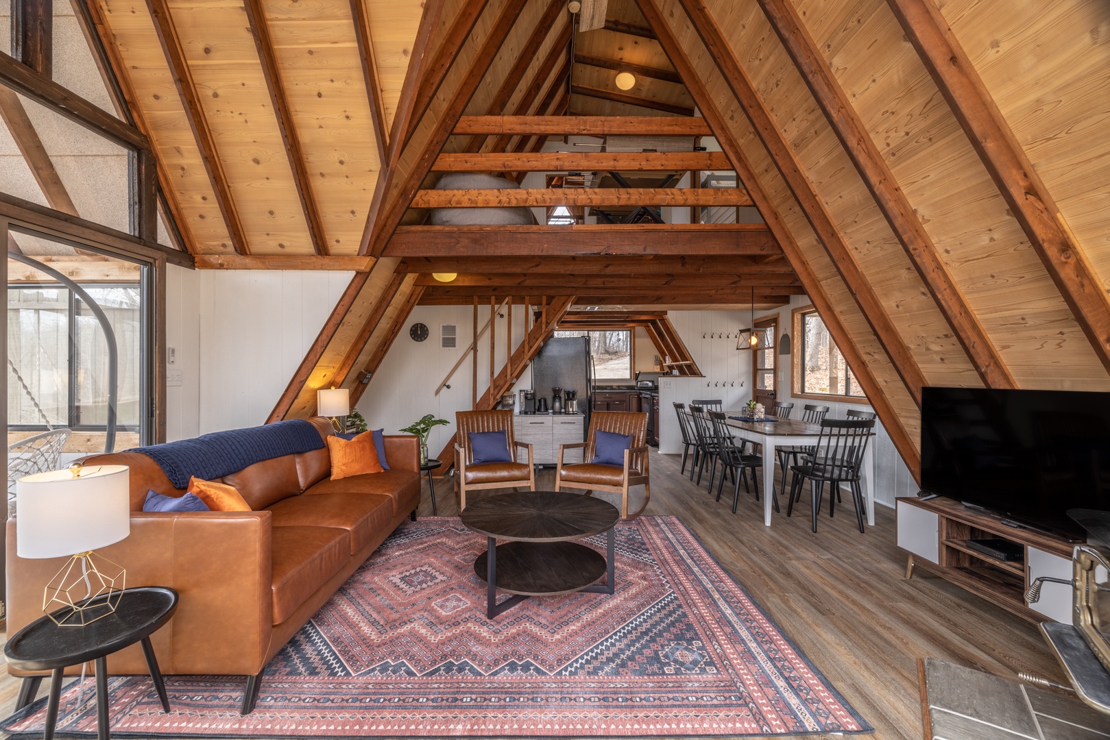 The living area of Restful Ridge is tastefully decorated with mid century inspired decor to set a peaceful scene for rest and relaxation. “Beautiful decor” - April