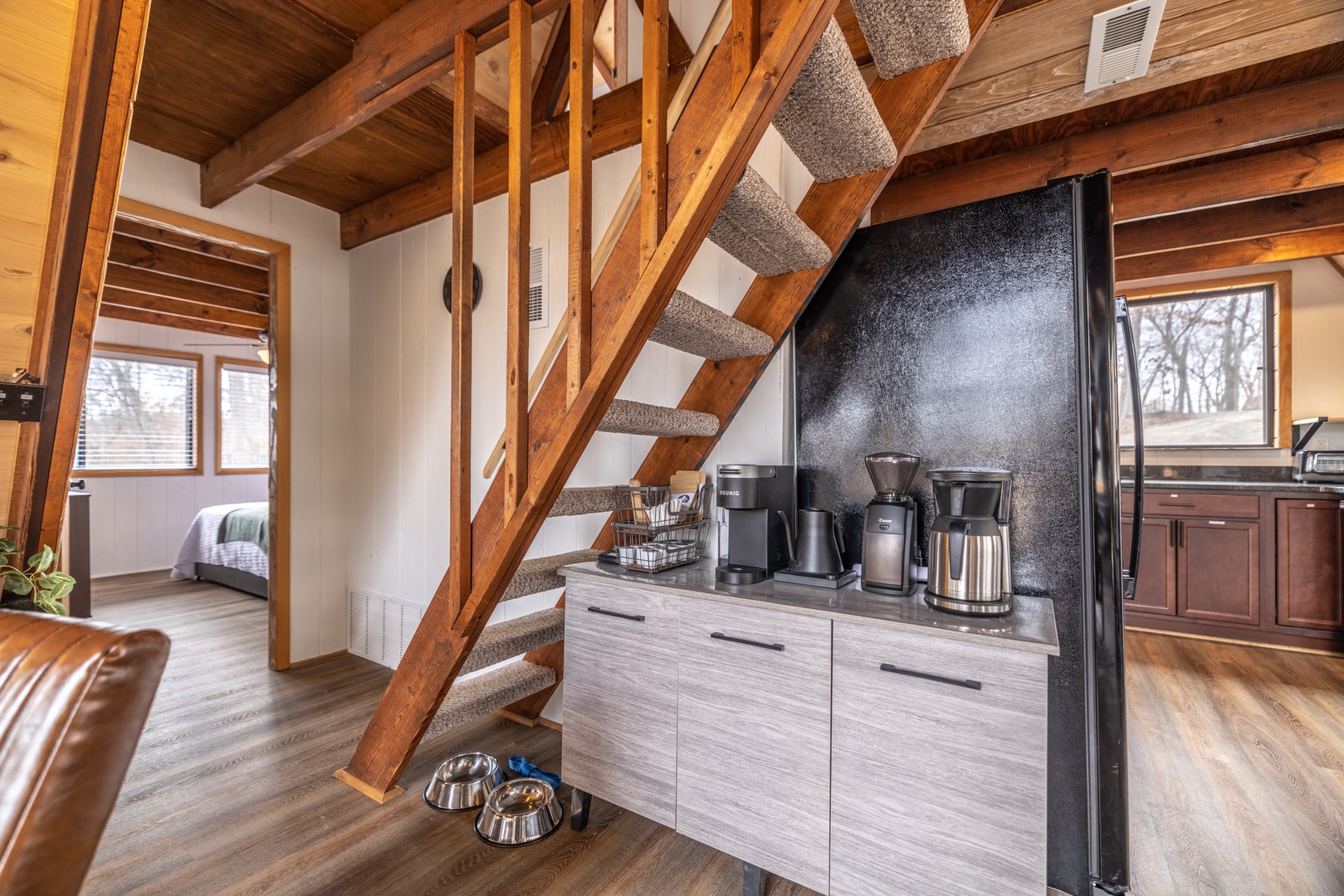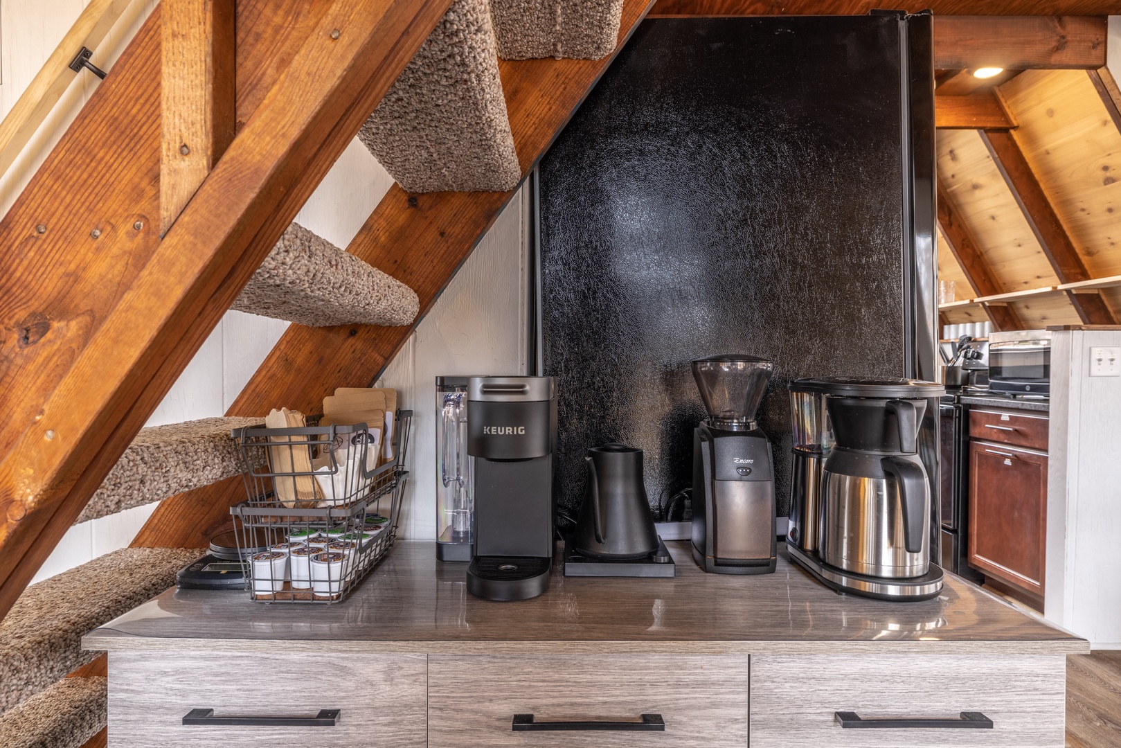 Set between the kitchen and the living area is a fully equi[ped coffee bar!