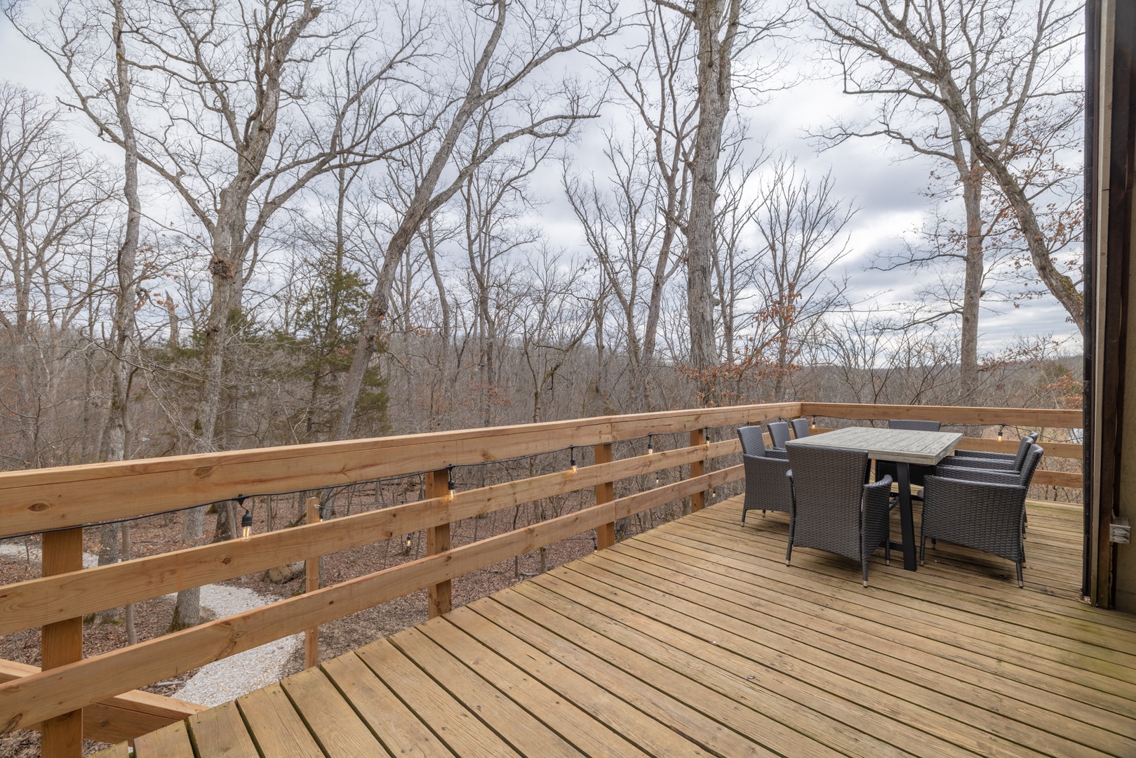 The picturesque deck surrounded by the woods overlooks the patio area.