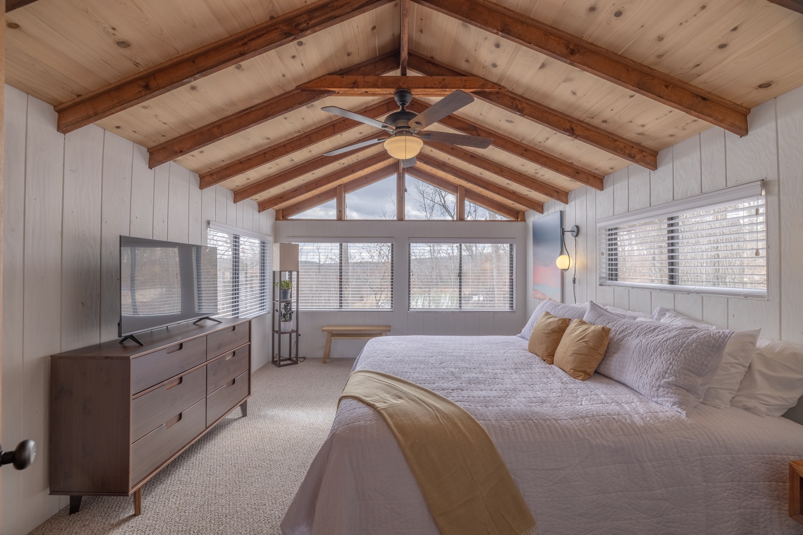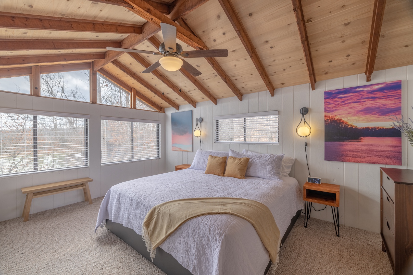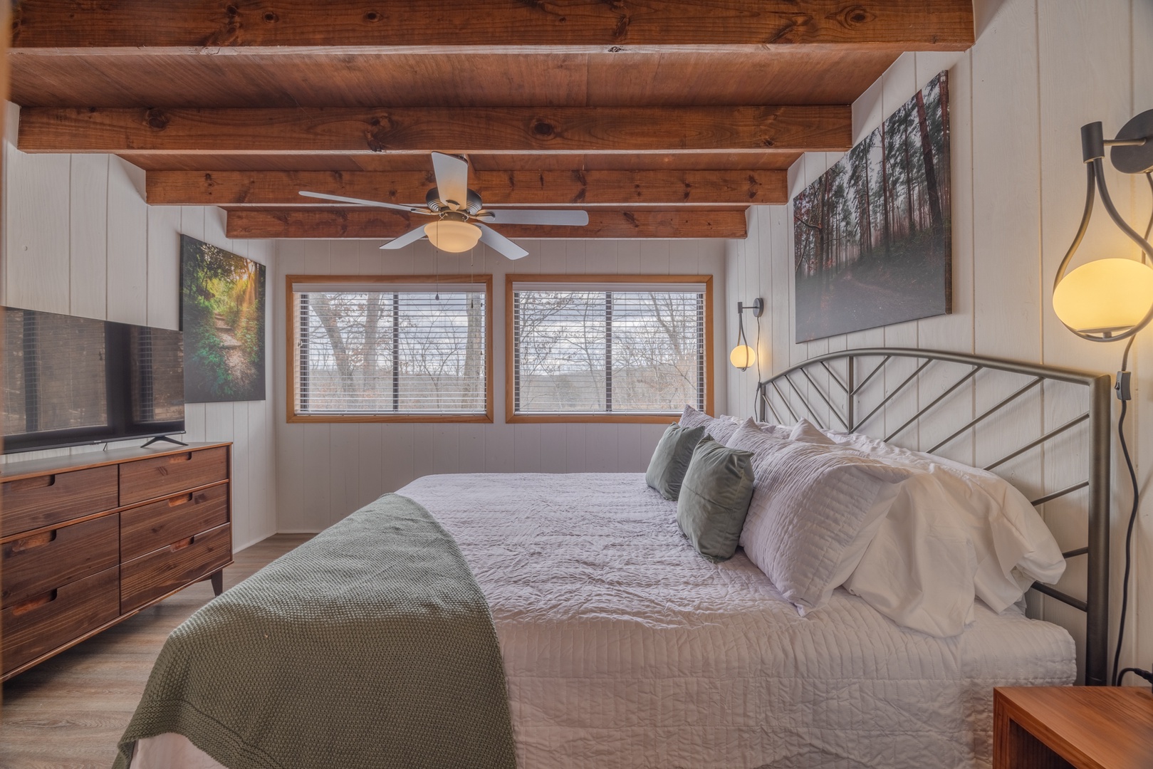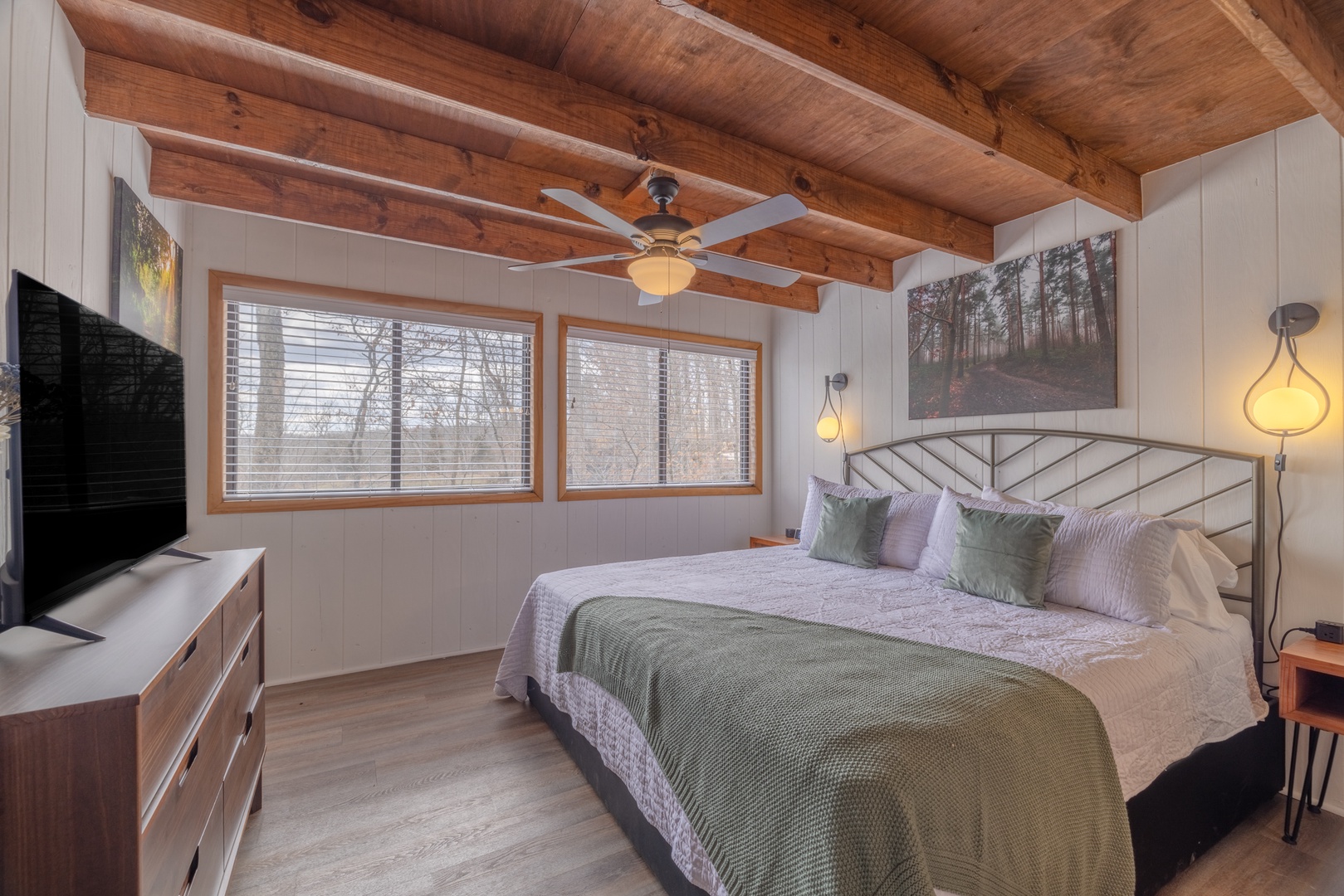 Bedroom 1 -The king sized bed and premium bedding will give you restful sleep with the charming wooded views. “Would stay again” - Felix the Cat