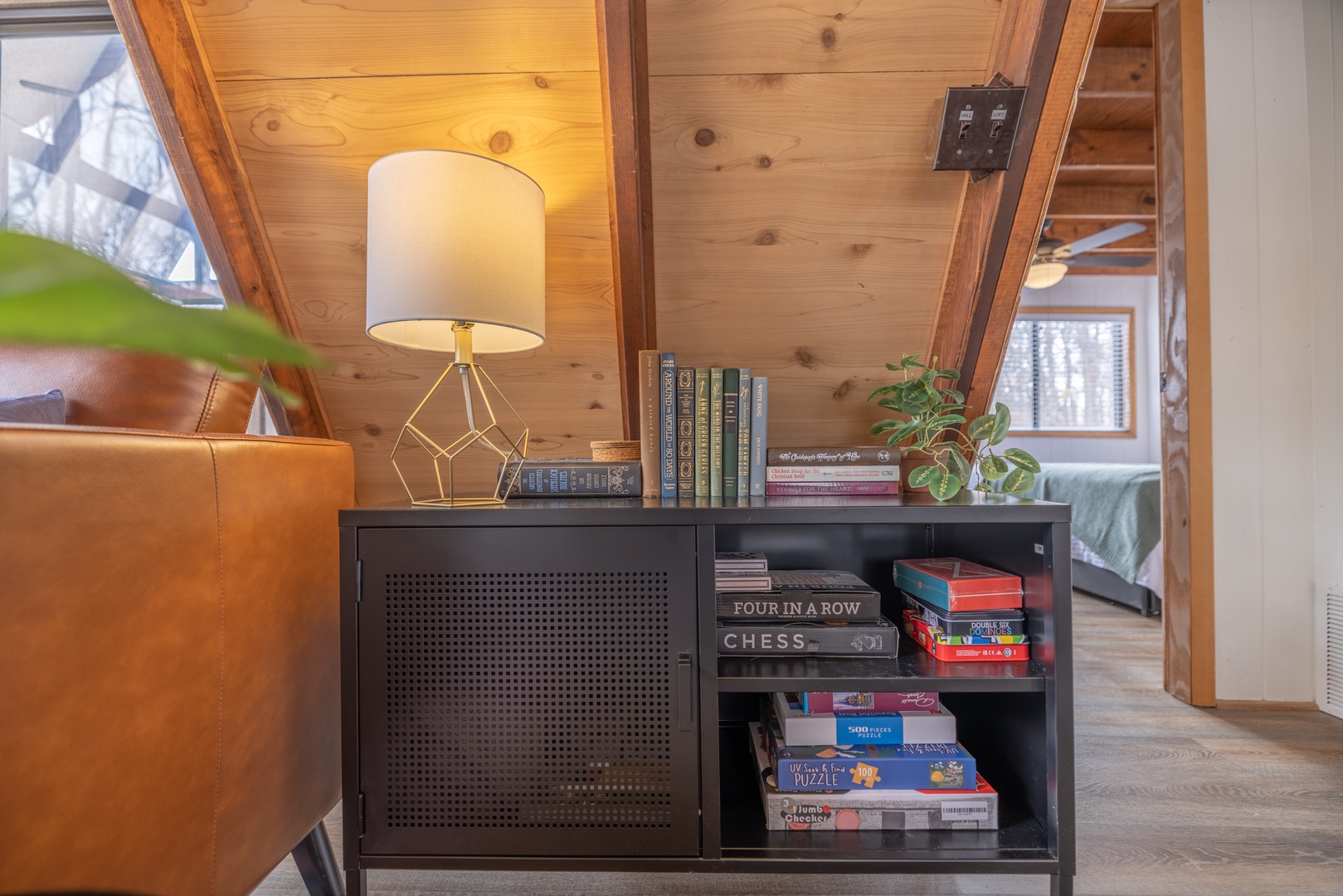 Between the living area and the first floor bedroom, check out the games and selection of books perfect for a vacation read.