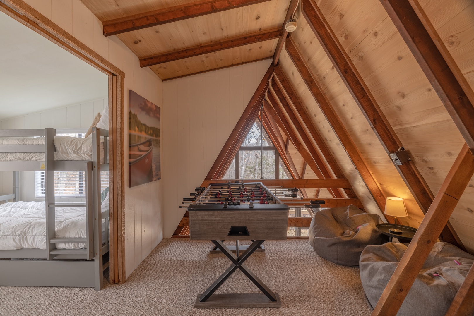 Enjoy cozy evenings by the wood-burning stove, challenge your friends to foosball, or curl up in the sunroom with a good book. Tech and family friendly.