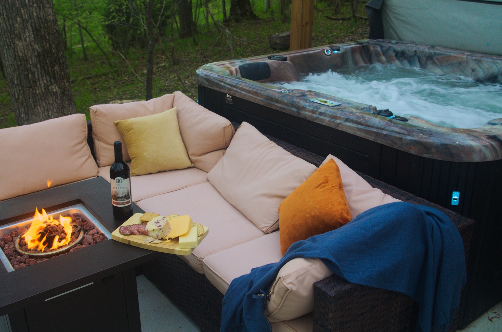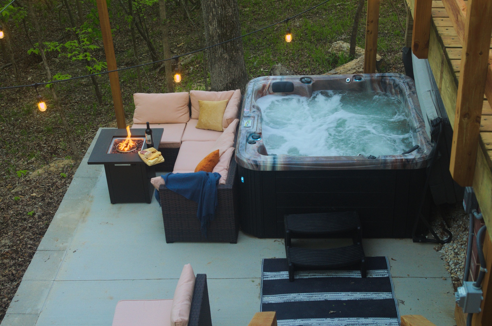 Unwind in the hot tub or cozy up in front of the fire table as you take in the pleasant forest views at Restful Ridge . “Great experience!” - Jordan