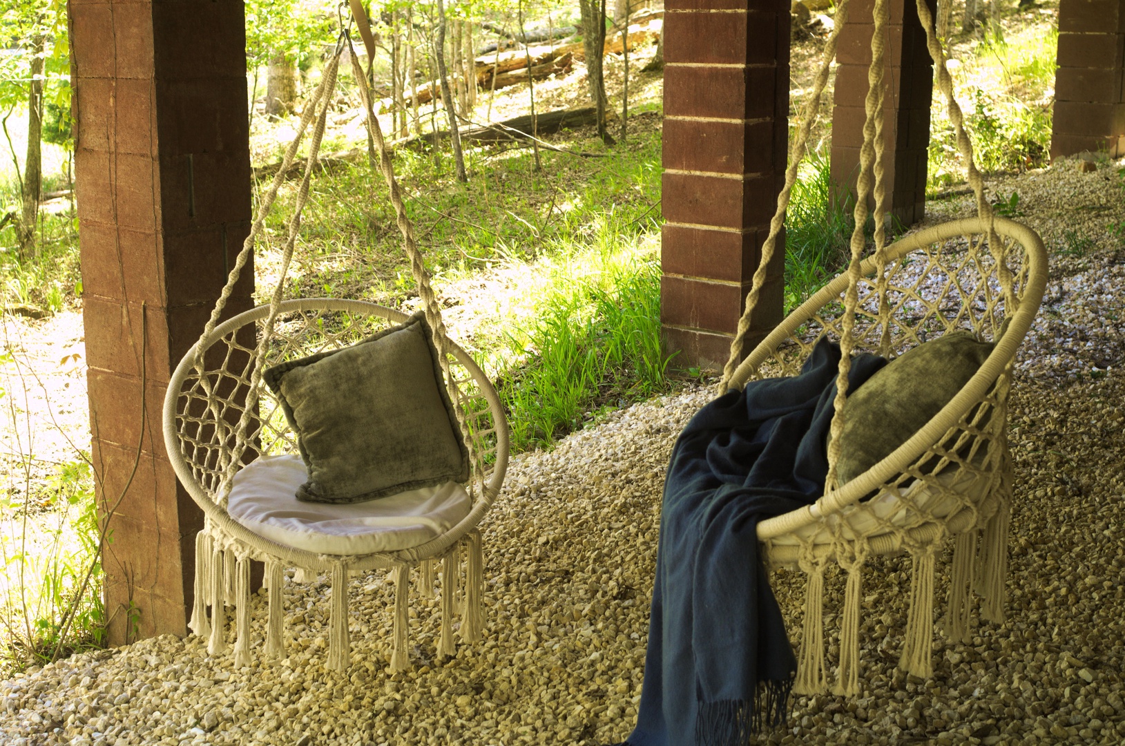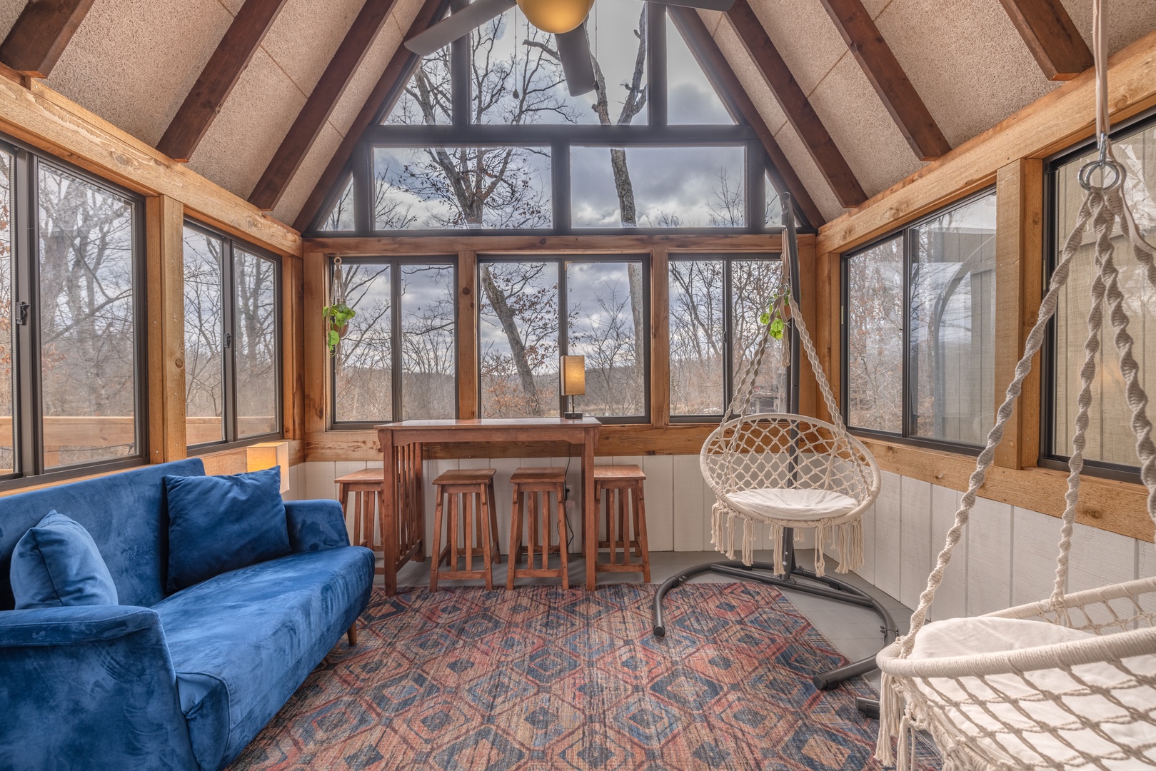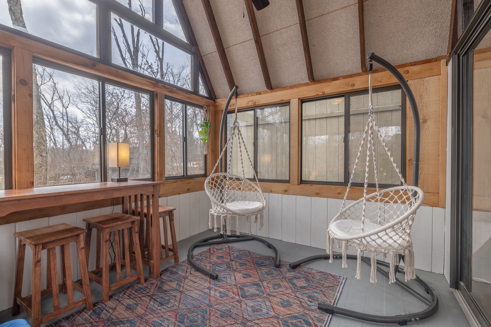 The sunroom is a perfect place to relax with a loved one as you share the pair of hanging chairs.