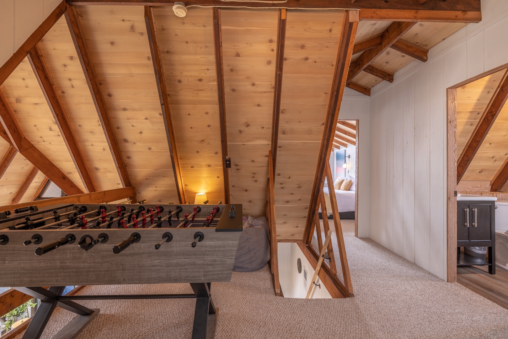 The second floor is home to the game area, second bathroom and two bedrooms.