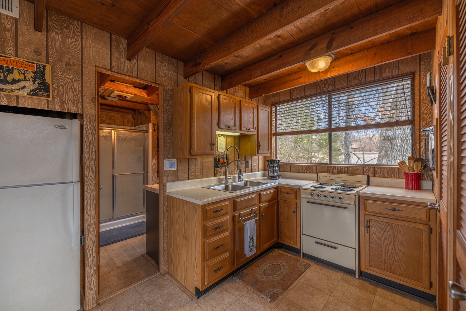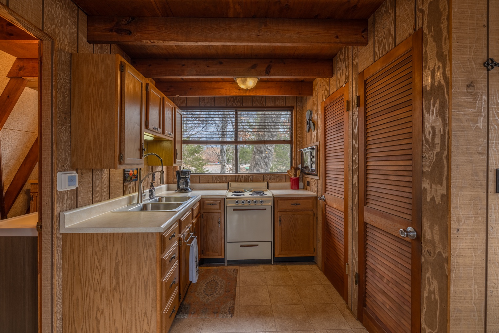 Step into the spacious living area, where comfort meets stunning views. The expansive windows bring the beauty of the outdoors inside, making it the perfect place to gather around the wood-burning stove, relax on the comfy furniture, or enjoy a movie on the mounted TV. The open floor plan seamlessly connects the living room to the dining area and fully equipped kitchen—ideal for cooking up meals together or enjoying your favorite snacks.