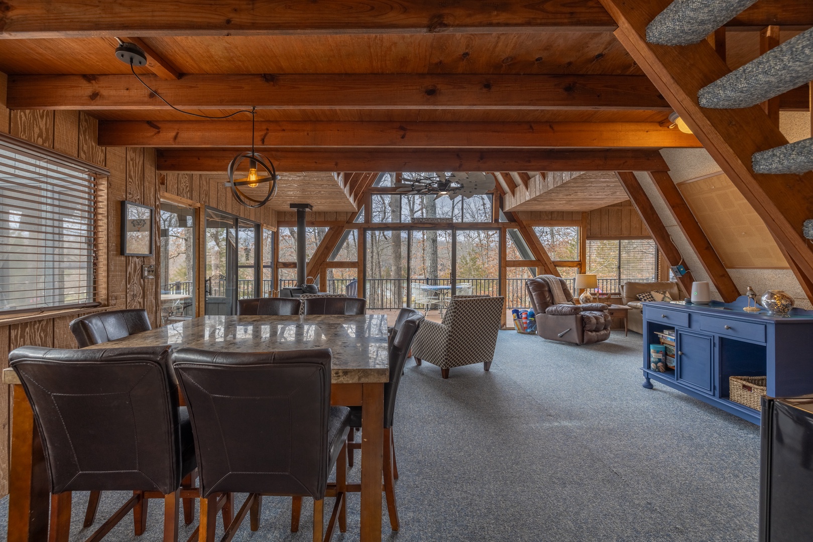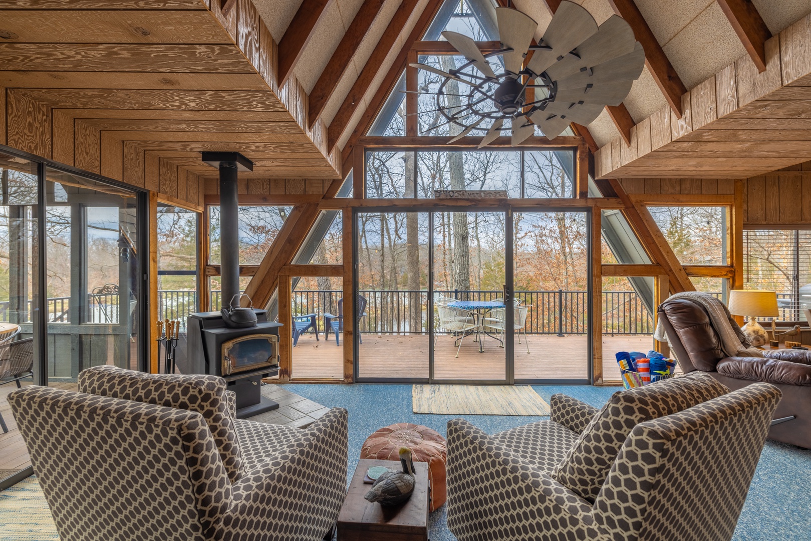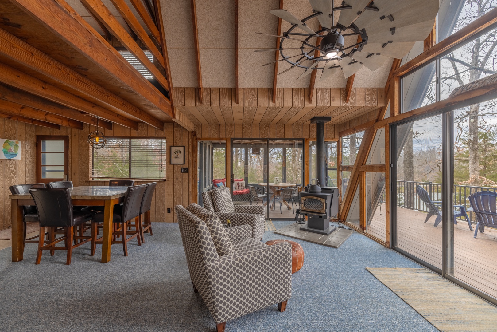 • Main living area – expansive living space with comfortable furniture, wood burning fireplace/stove, mounted TV, and surrounded by expansive windows offering incredible views of the outdoors