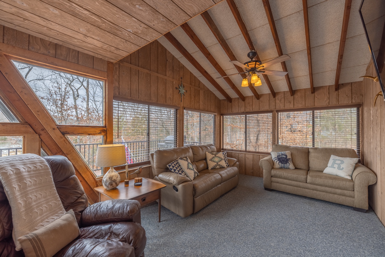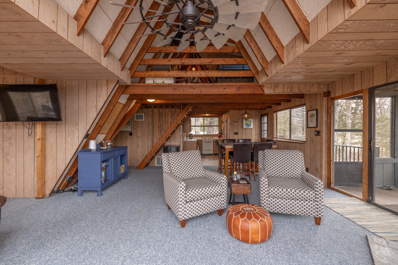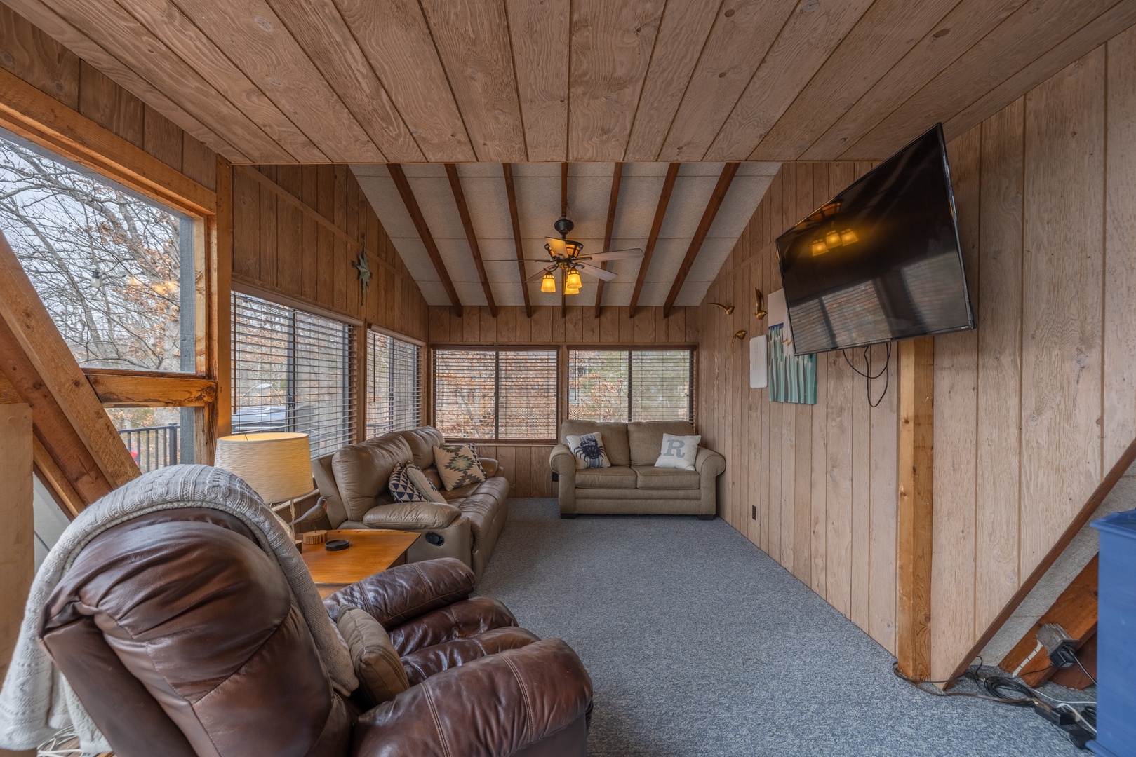 • Main living area – expansive living space with comfortable furniture, wood burning fireplace/stove, mounted TV, and surrounded by expansive windows offering incredible views of the outdoors
