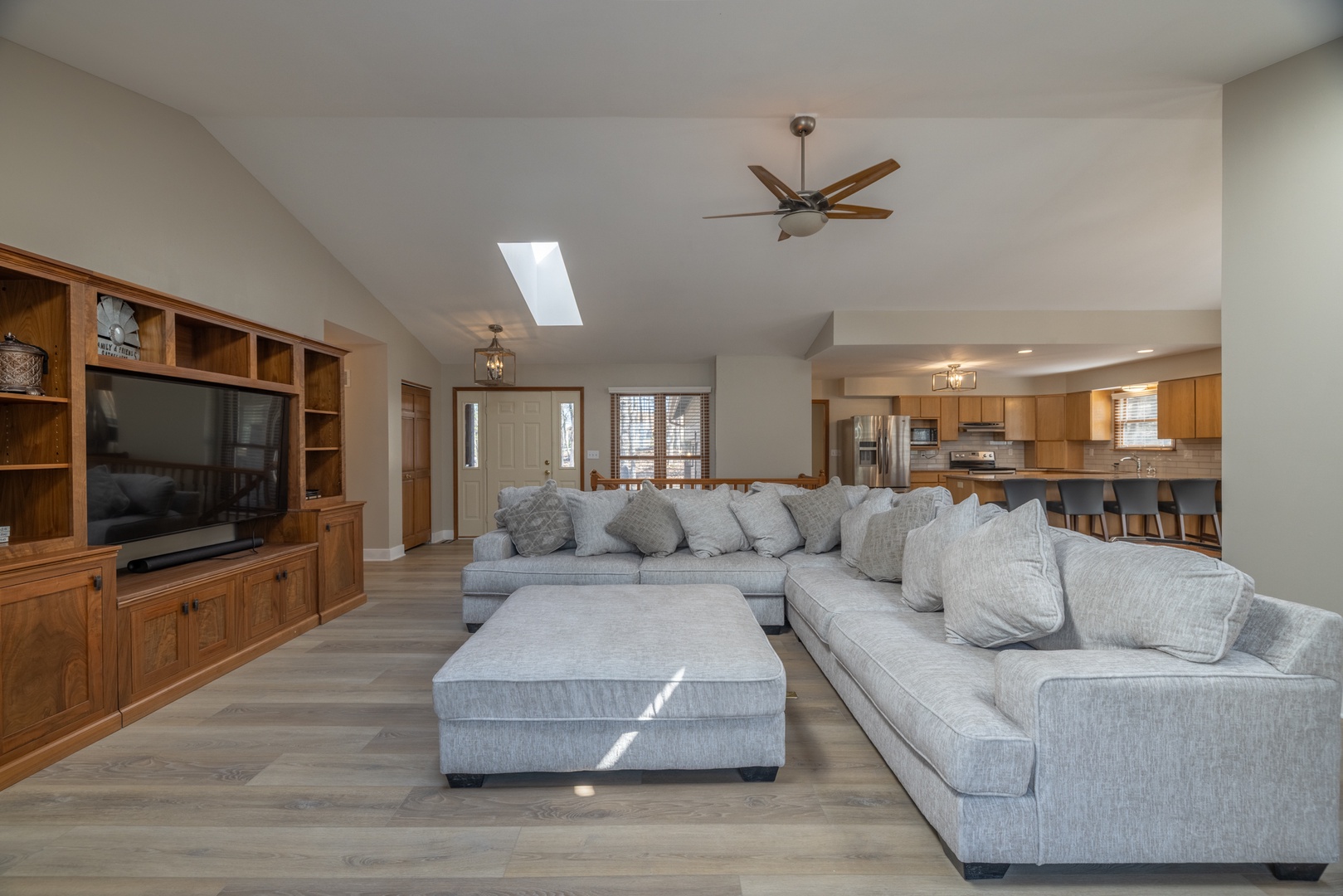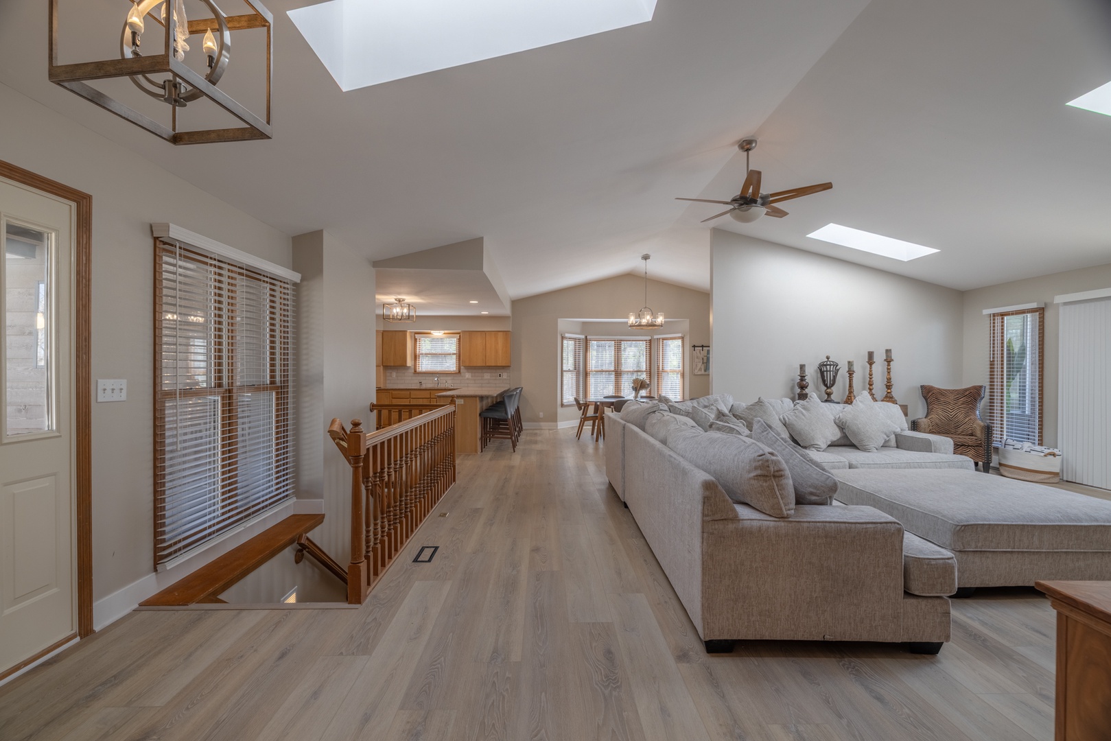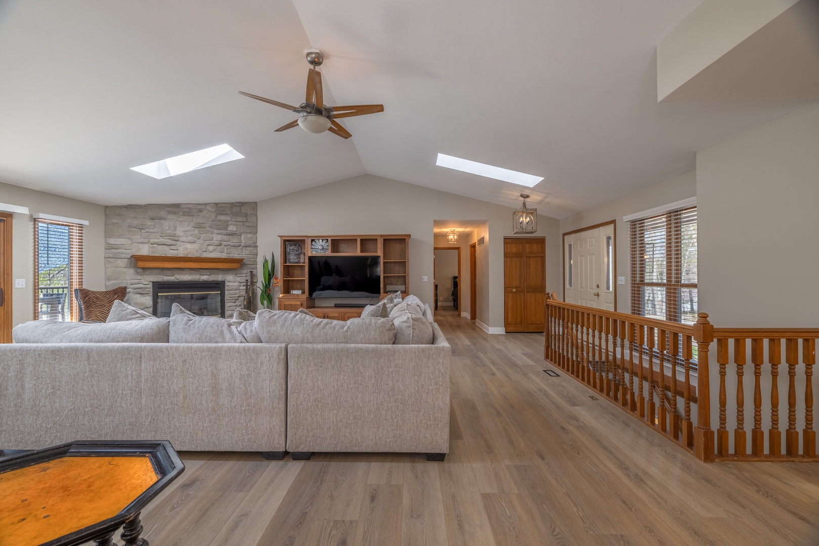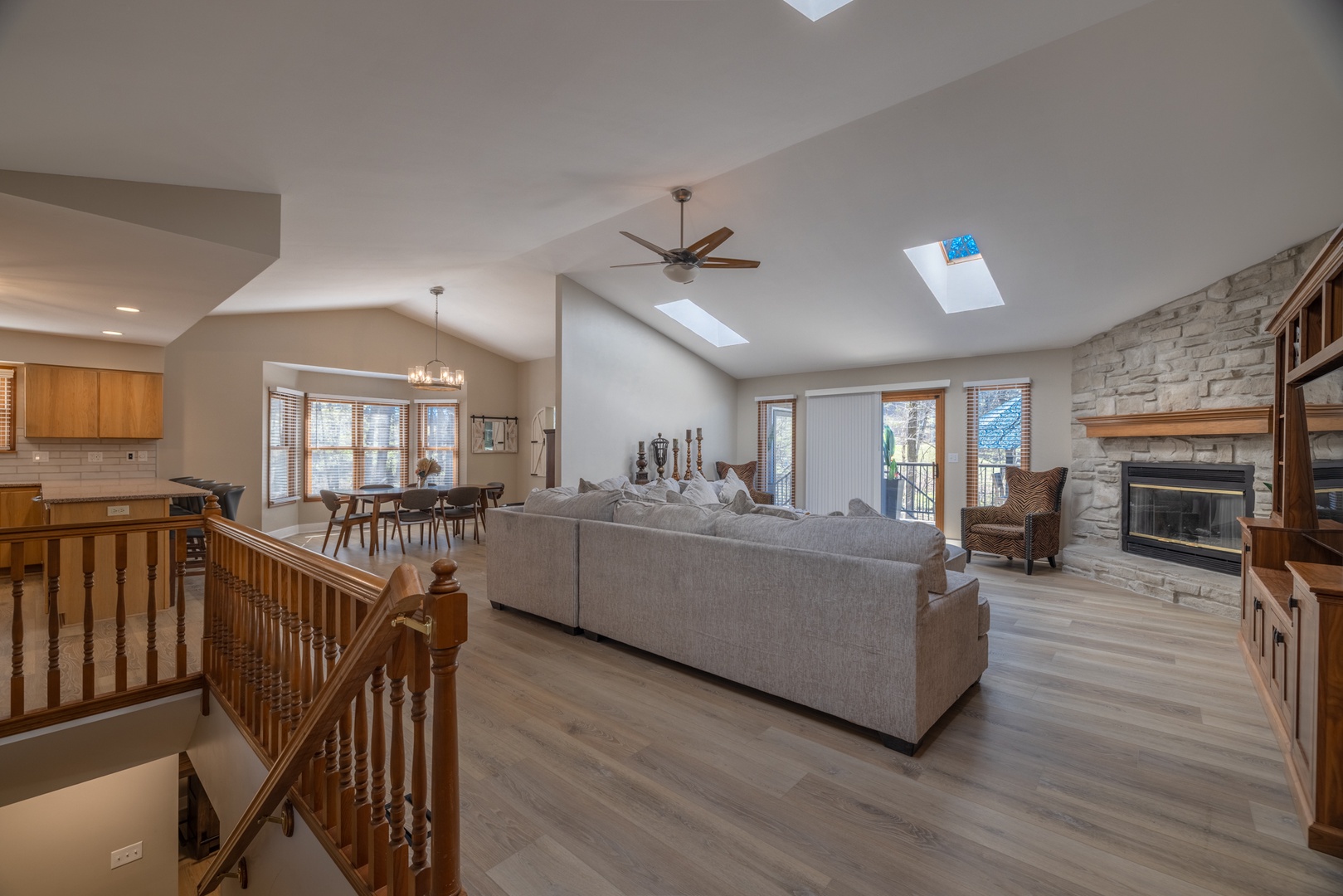 • Open living area – spacious living room with vaulted ceilings, multiple sky lights allowing natural light to fill the space, fireplace, and cozy sectional