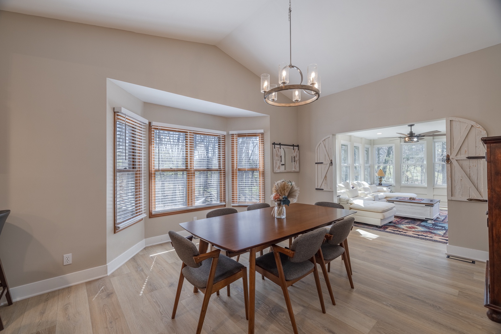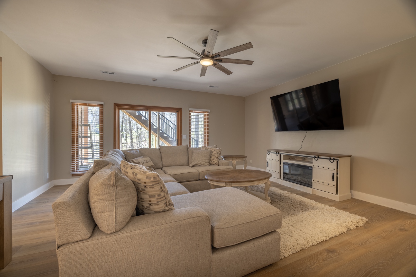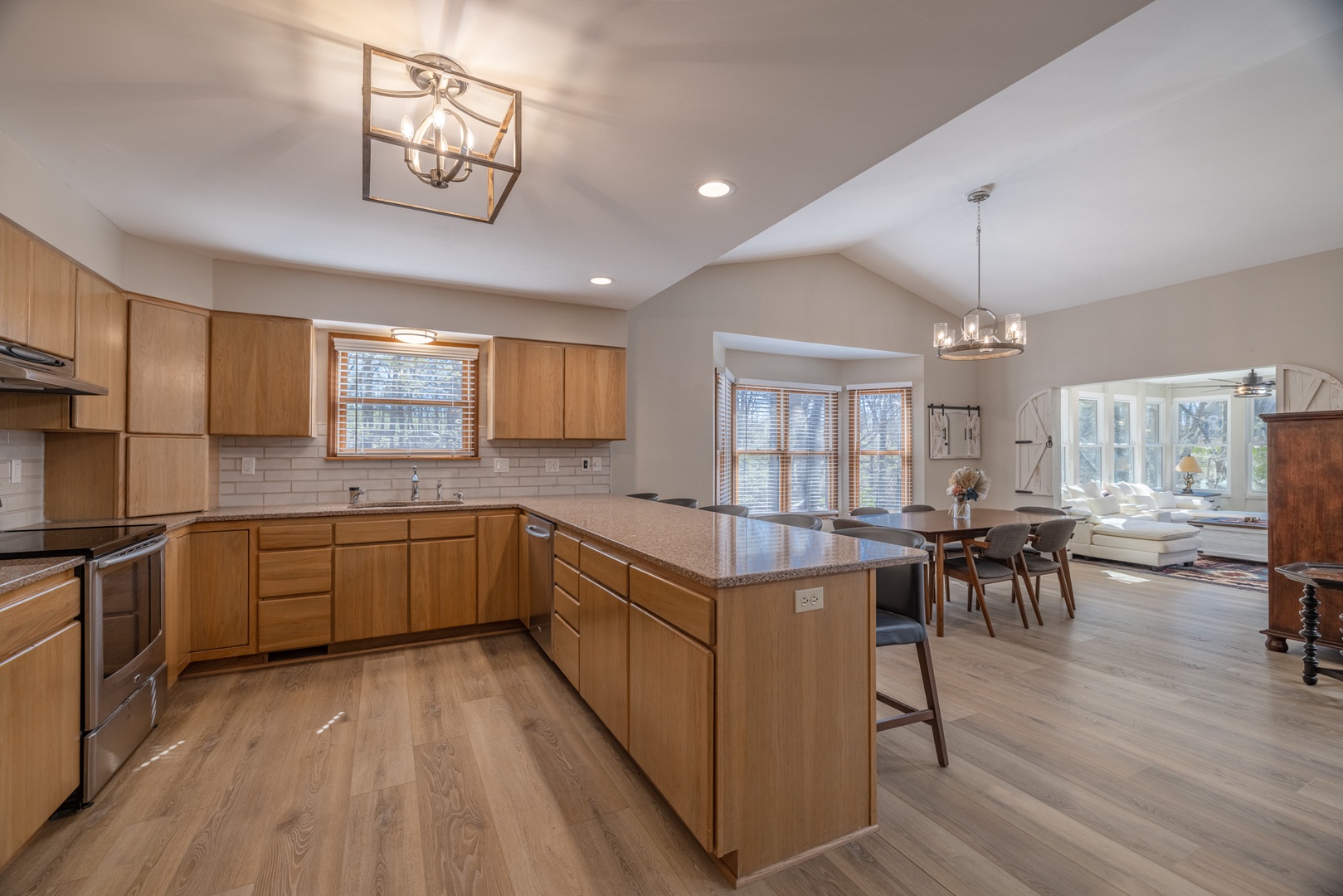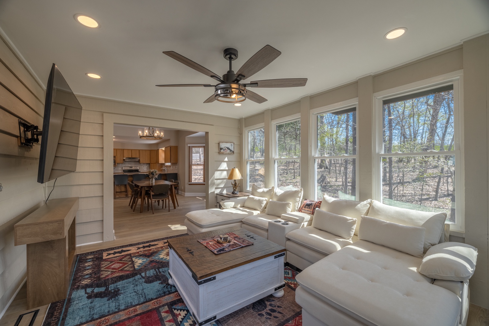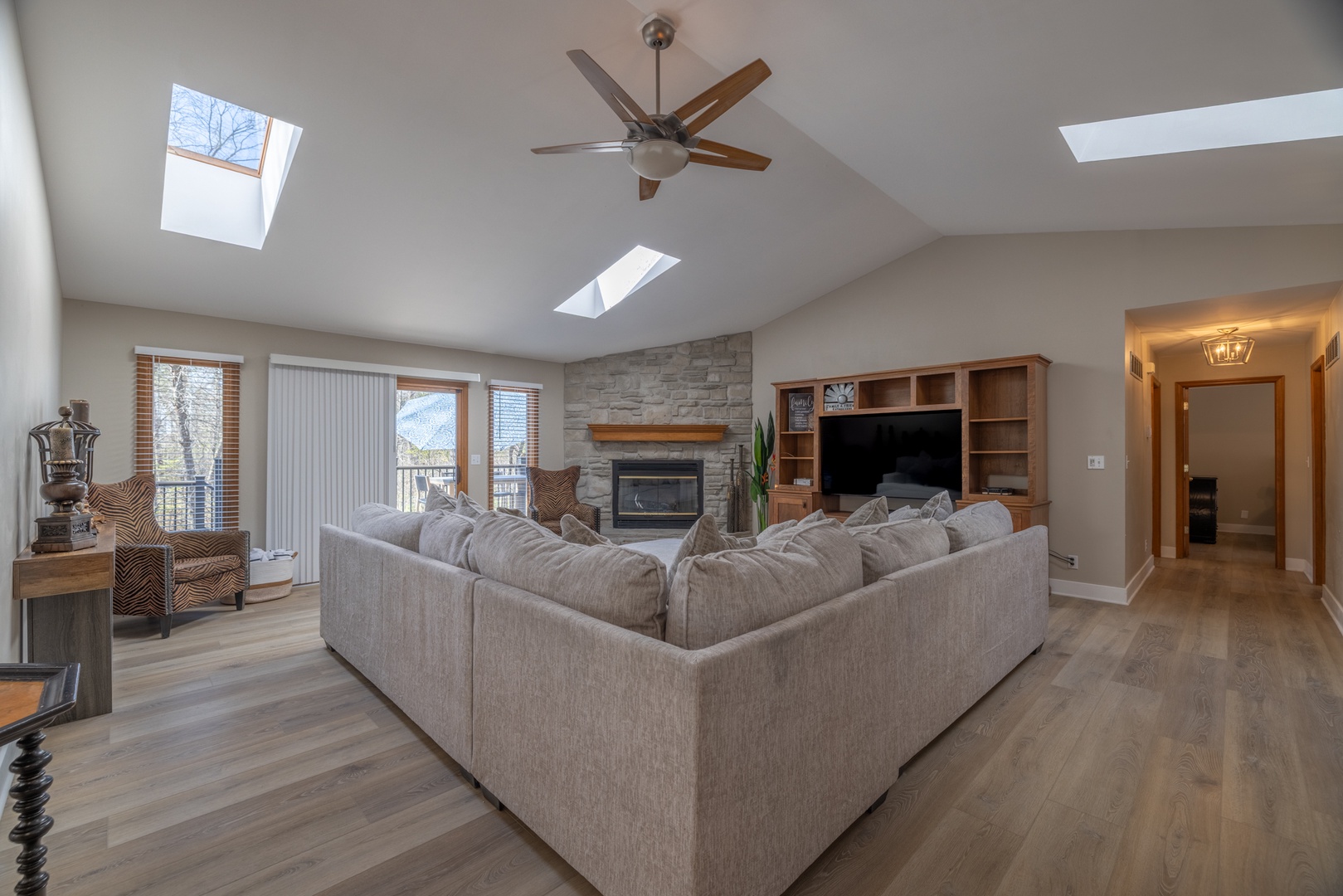 • Open living area – spacious living room with vaulted ceilings, multiple sky lights allowing natural light to fill the space, fireplace, and cozy sectional