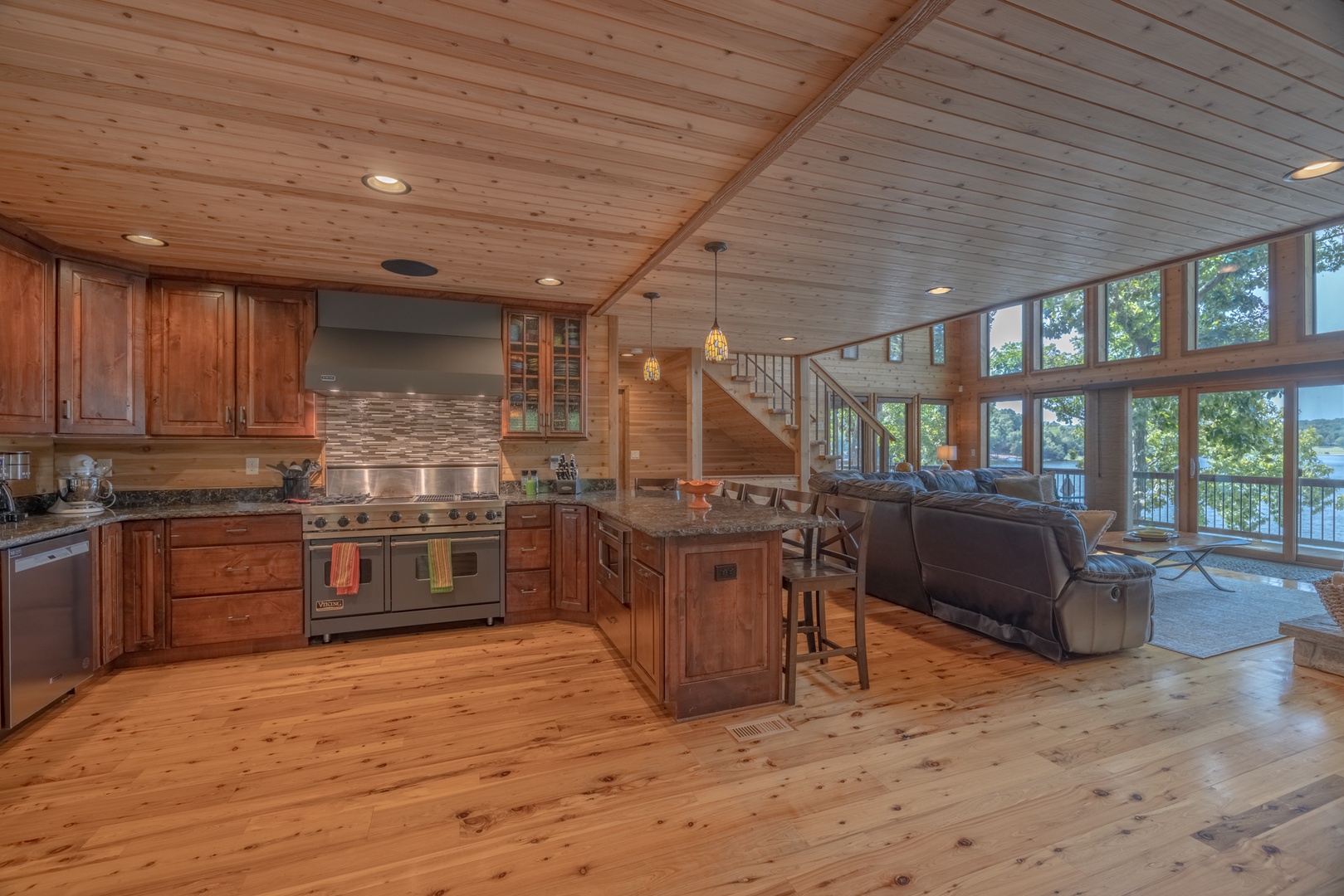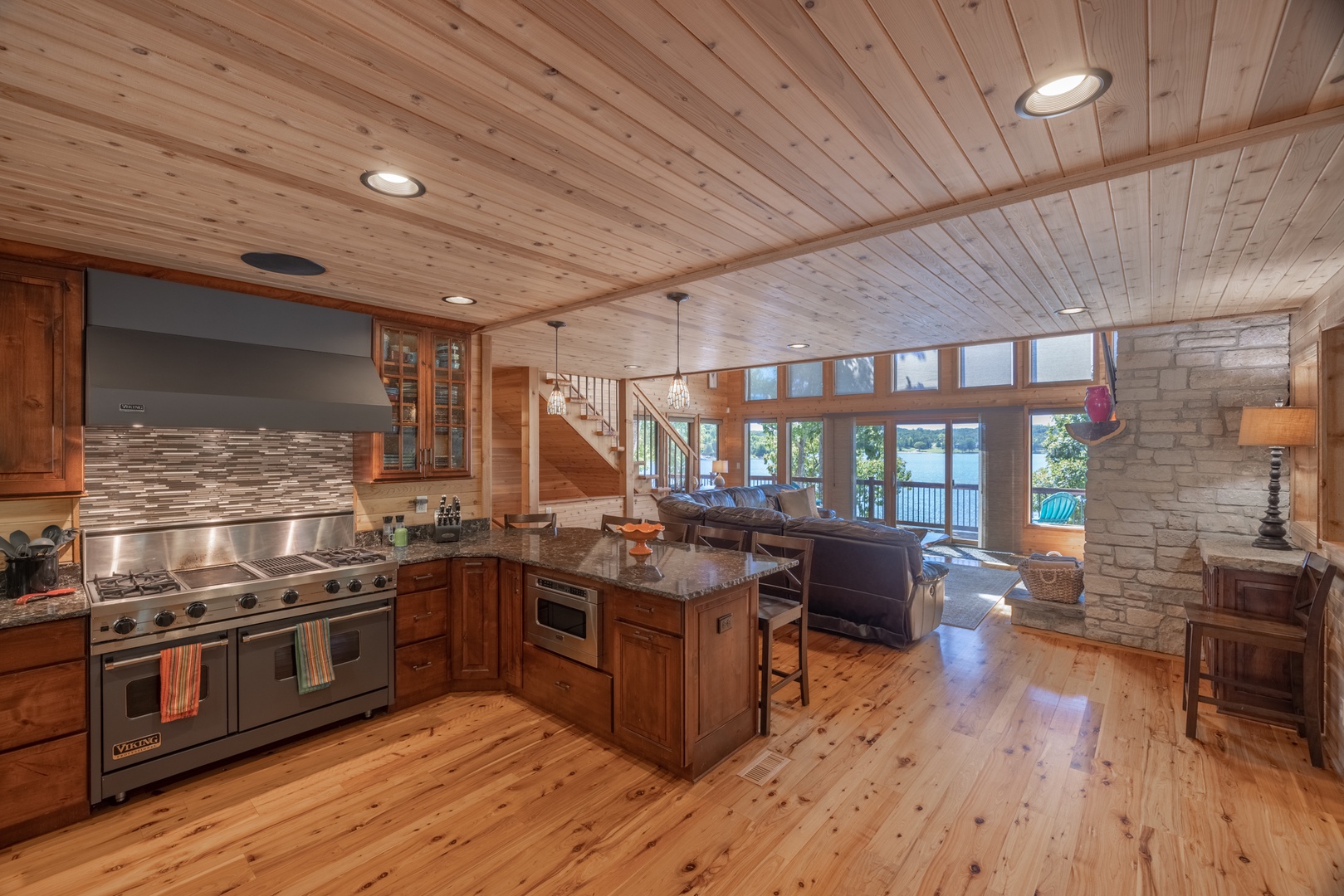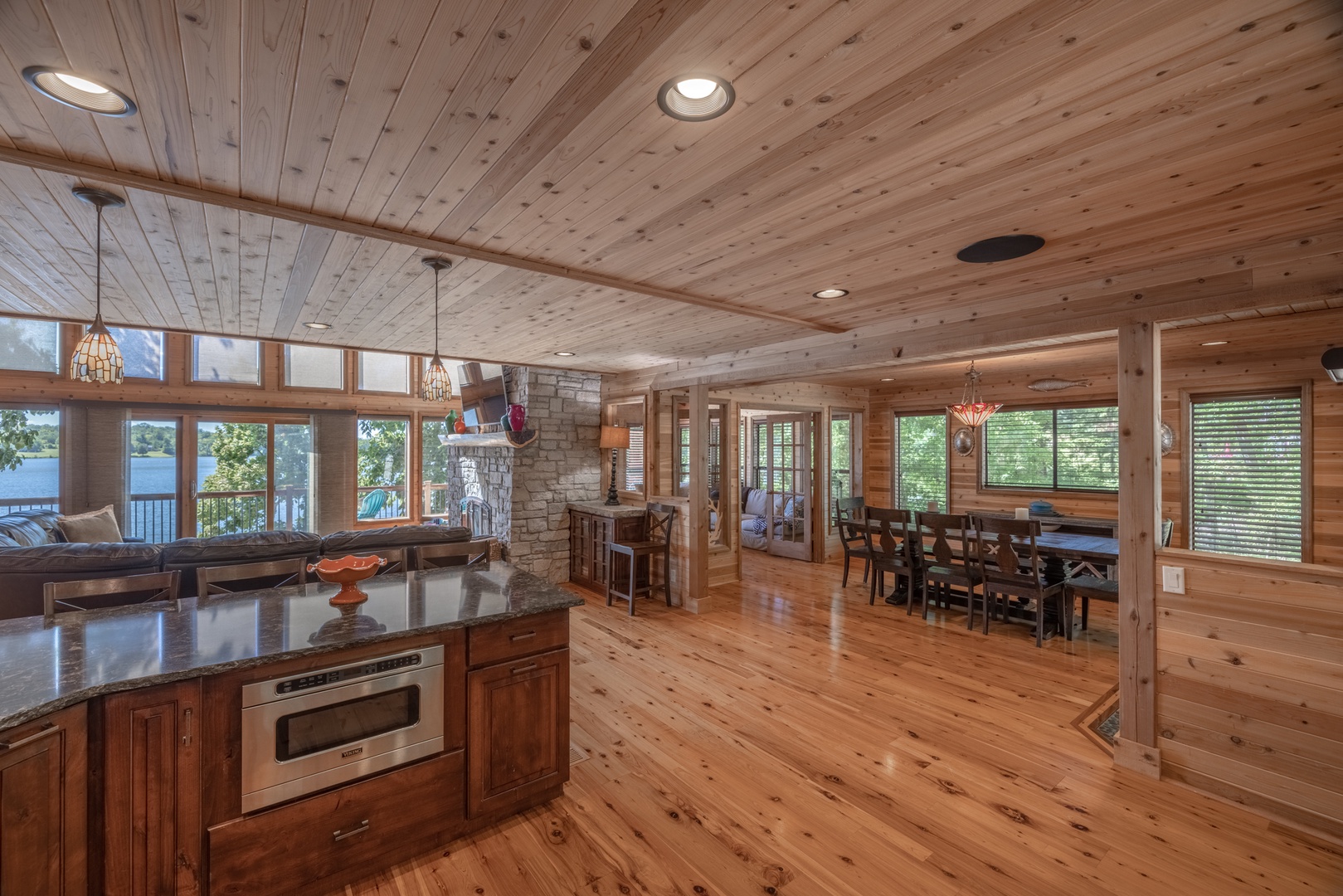 This premier property offers an immense amount of open living space with stunning panoramic views of Lake Aspen through the wall of floor-to-ceiling windows. Handcrafted with cedar beams and hardwood floors, this rustic design is beautifully outfitted with an oversized sectional with reclining chairs, a stone fireplace, smart TVs, fully equipped kitchen with custom cabinetry, granite countertops, breakfast bar and Viking stainless steel appliances, spacious sunroom, and farmhouse-style dining table.