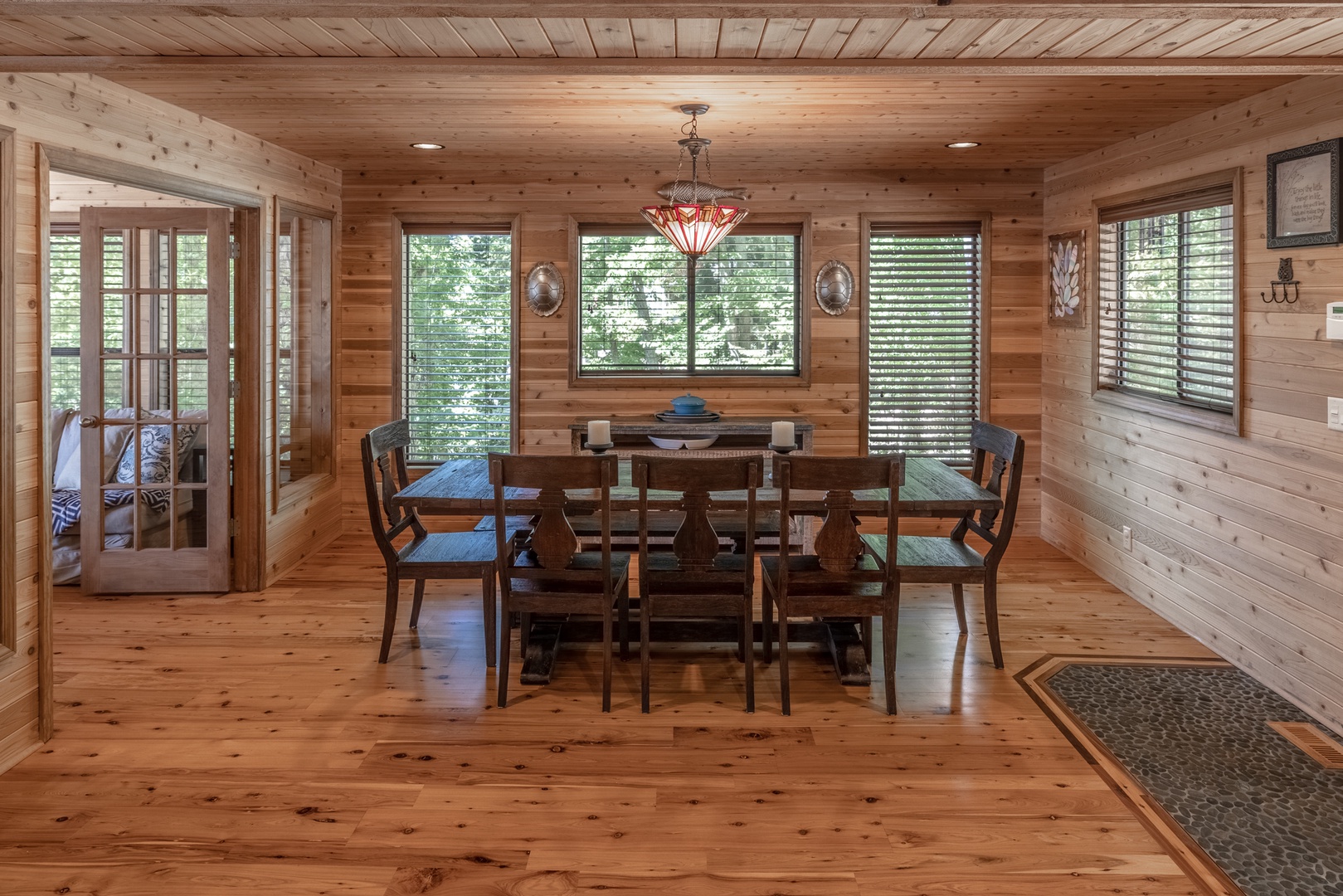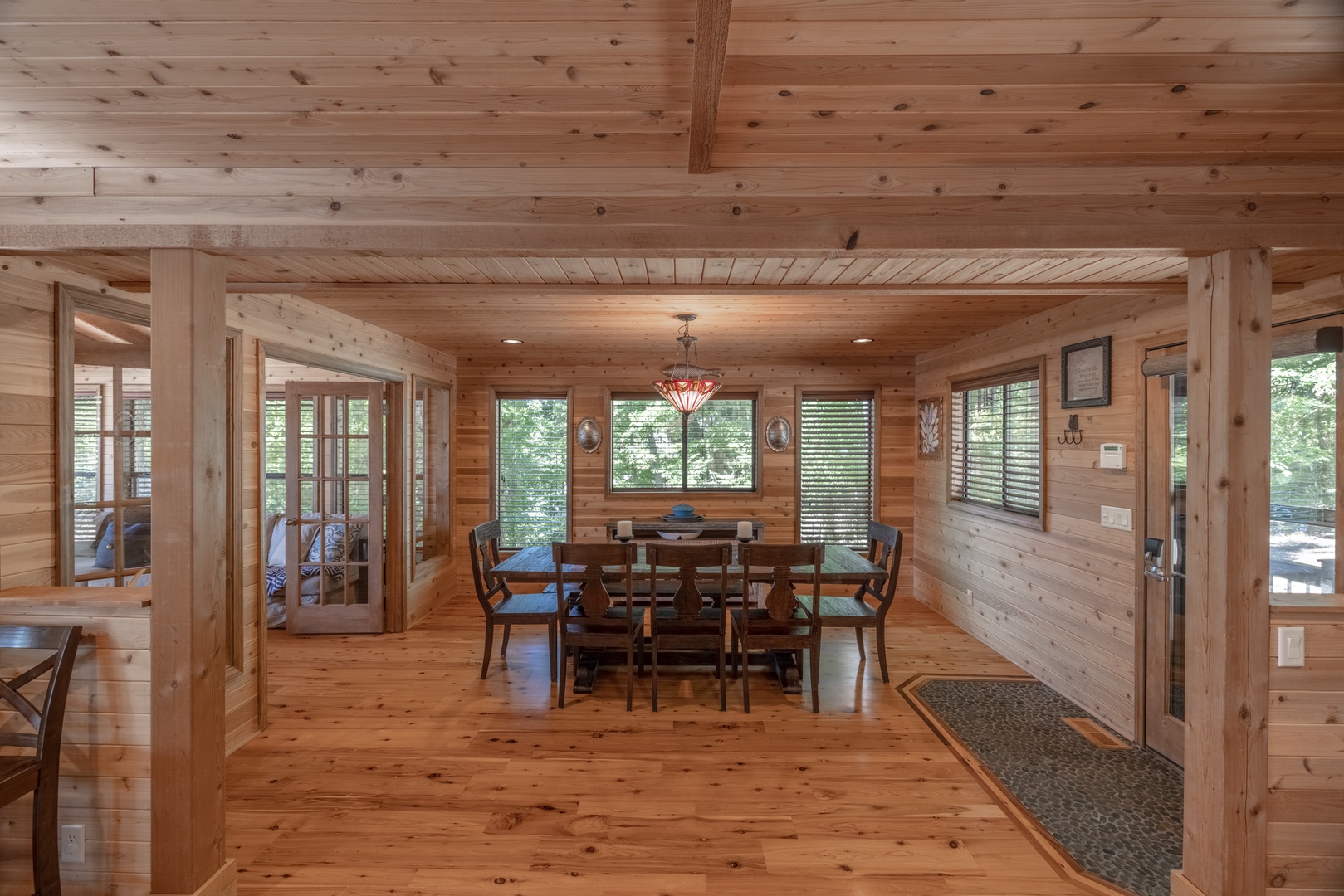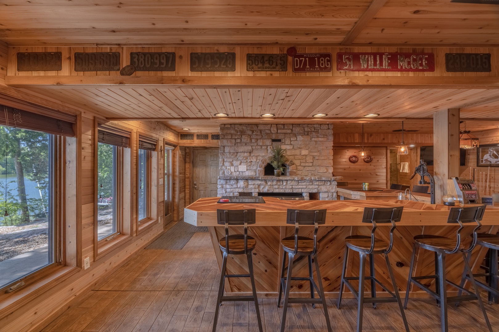 This premier property offers an immense amount of open living space with stunning panoramic views of Lake Aspen through the wall of floor-to-ceiling windows. Handcrafted with cedar beams and hardwood floors, this rustic design is beautifully outfitted with an oversized sectional with reclining chairs, a stone fireplace, smart TVs, fully equipped kitchen with custom cabinetry, granite countertops, breakfast bar and Viking stainless steel appliances, spacious sunroom, and farmhouse-style dining table.