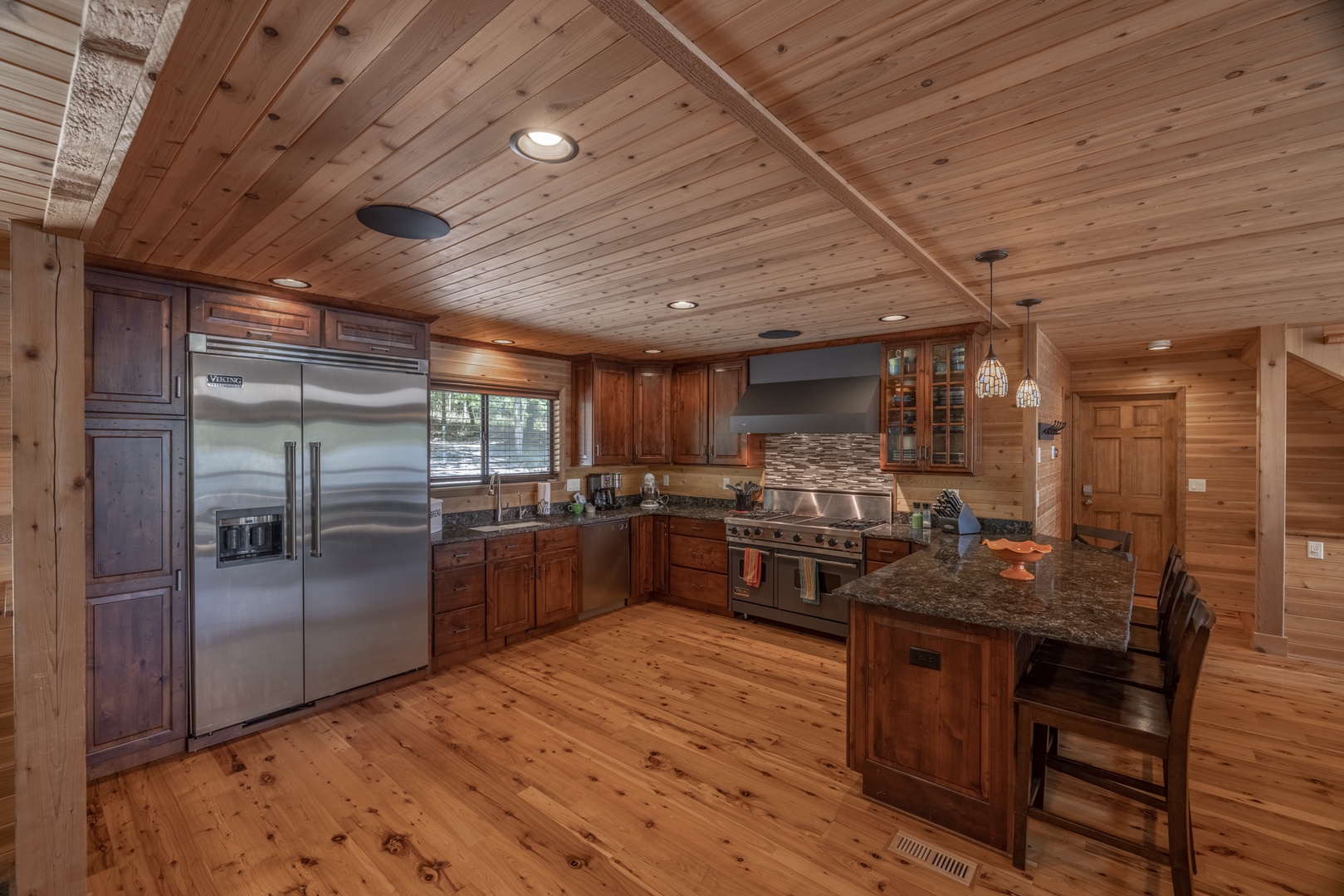 • Fully equipped kitchen in the main chalet with stainless steel appliances- Viking French door refrigerator, range stove and built-in microwave, and a Maytag dishwasher