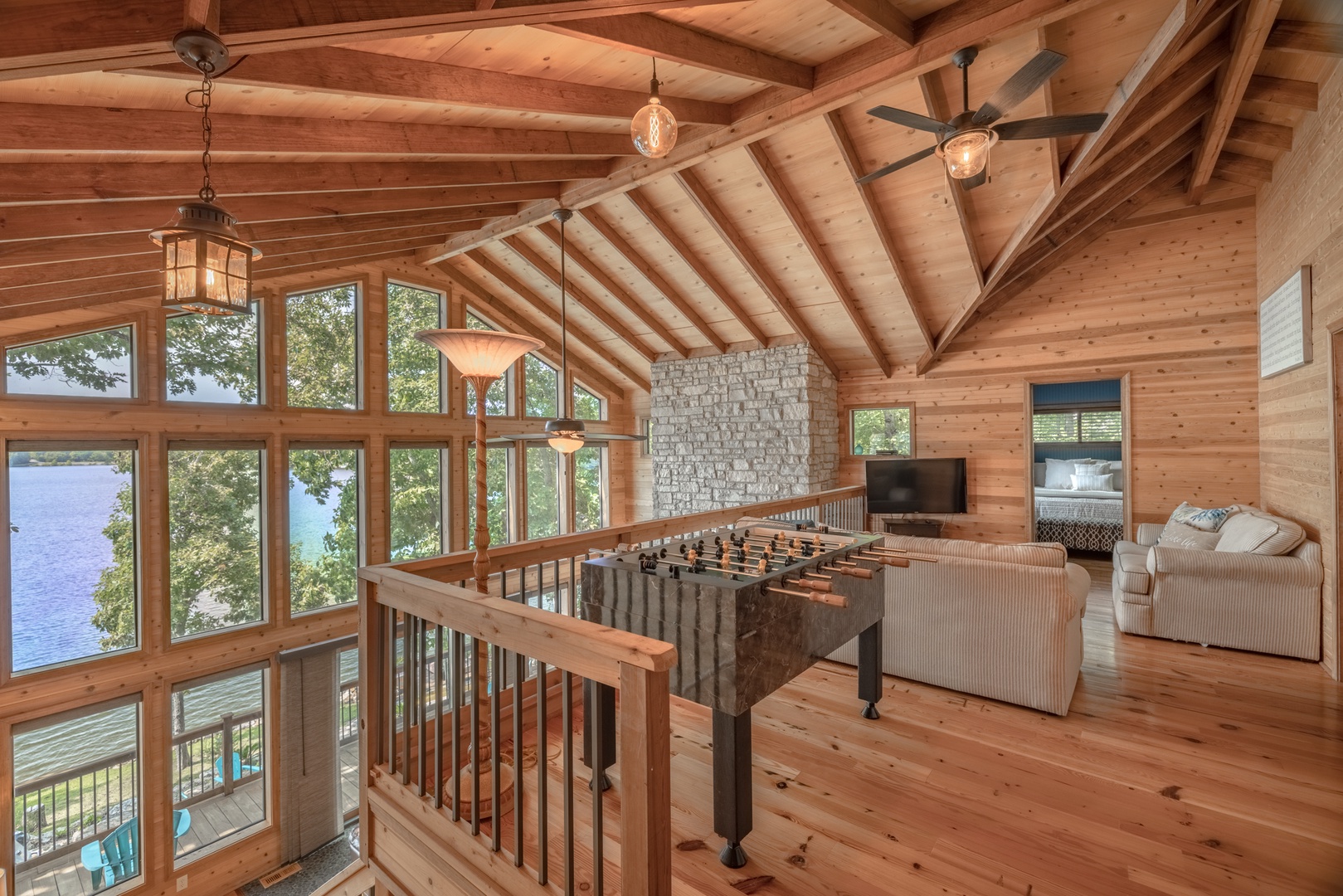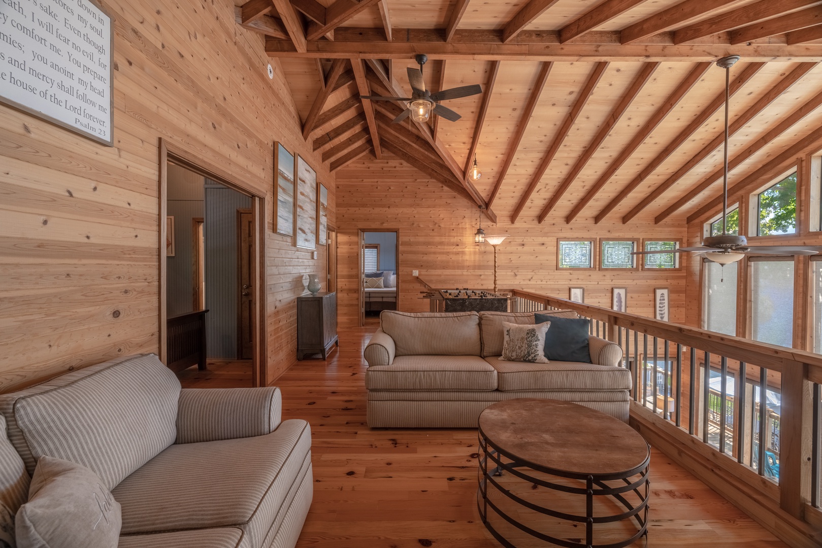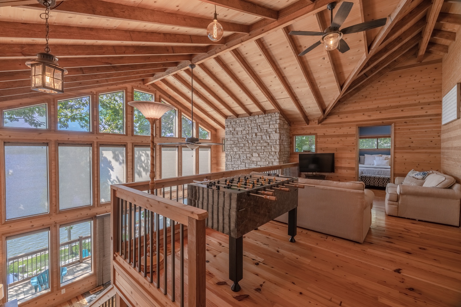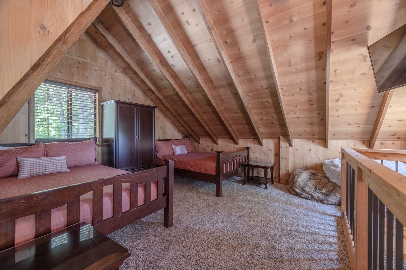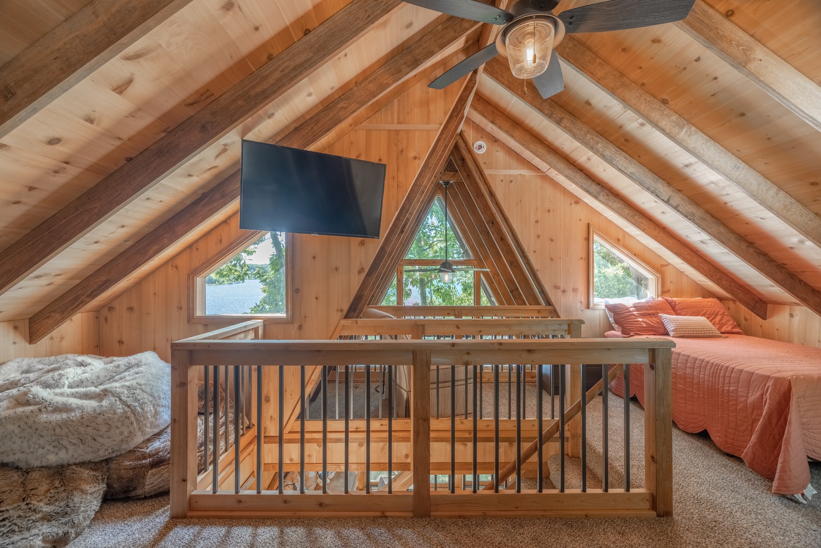 • Main chalet upper level- 3 bedrooms, 1 full bath, and loft area with foosball table, smart TV, and sleeper sofa