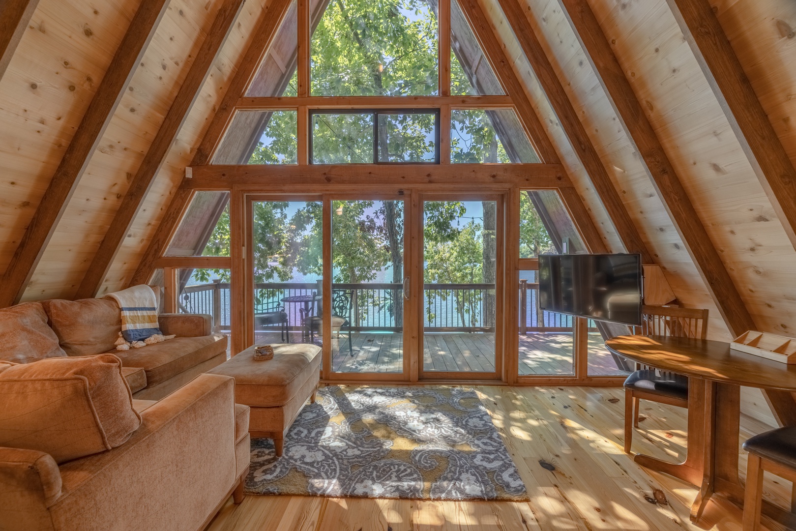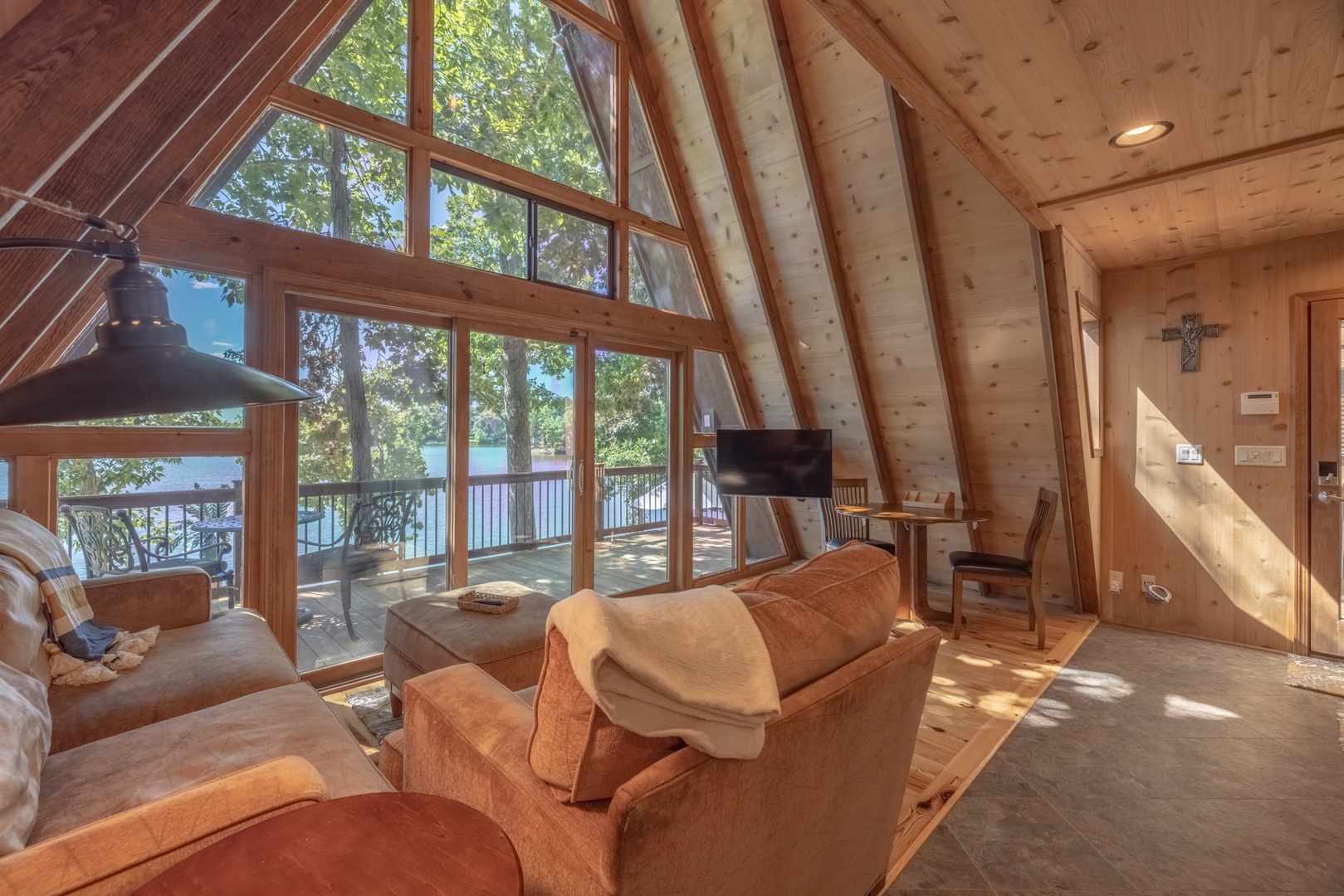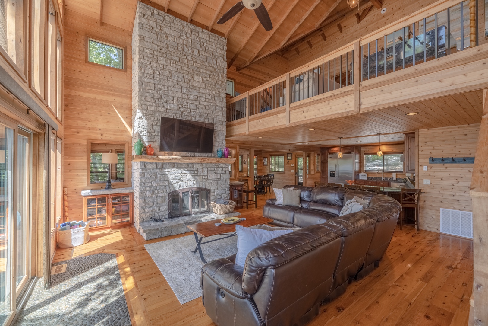 • Open living area in the main chalet with an oversized sectional, smart TV, stone fireplace, and sliding glass doors to the deck