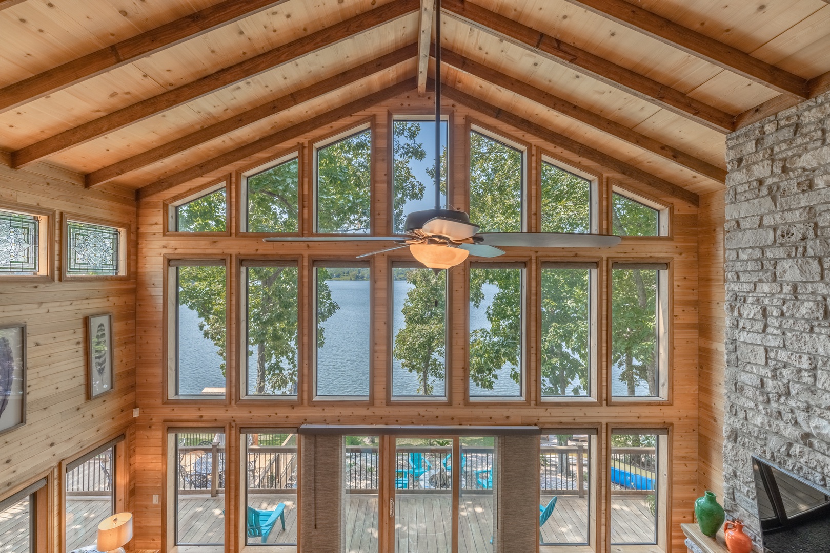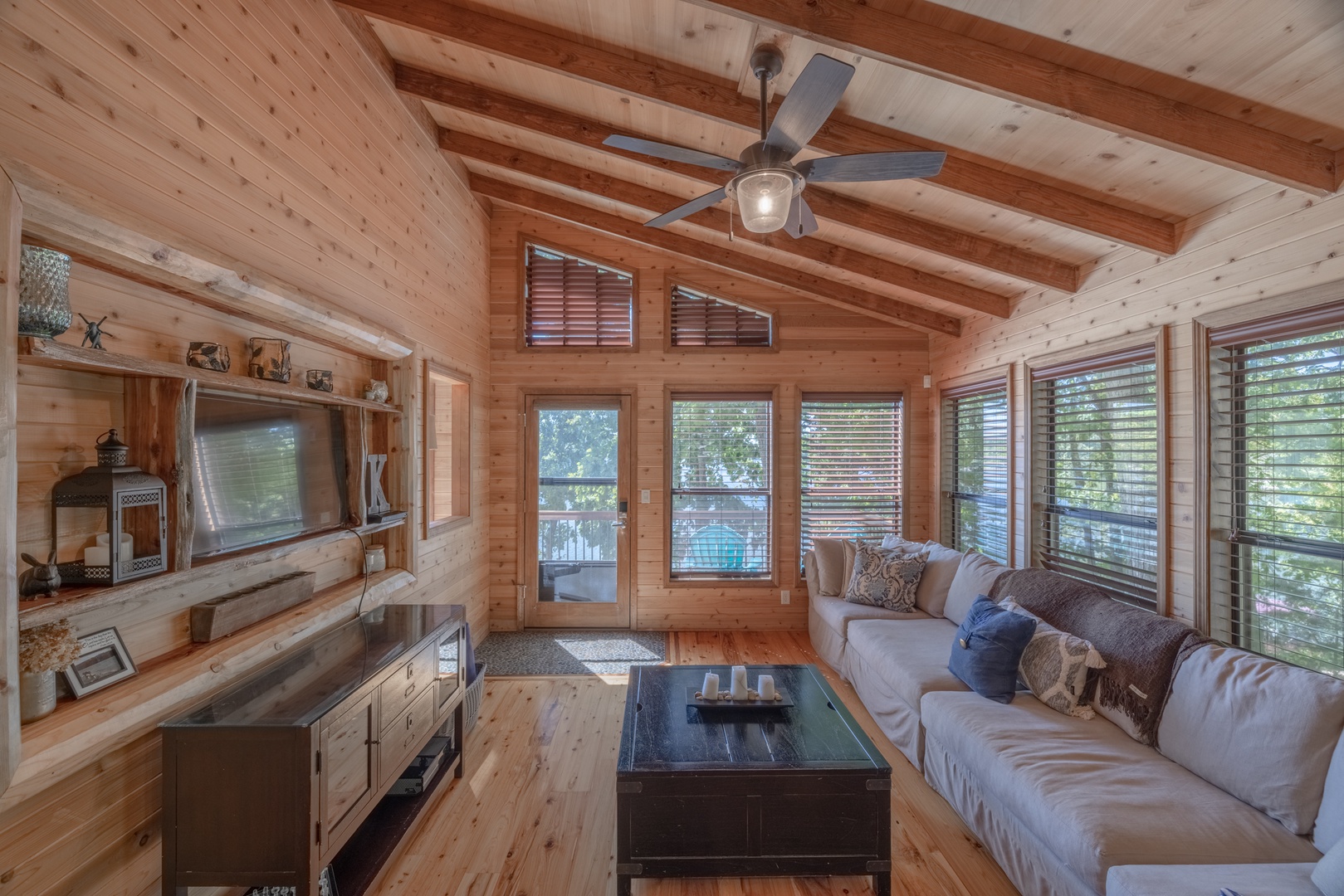 • Sunroom in the main chalet with oversized couch, smart TV, ceiling fan, and access to the deck