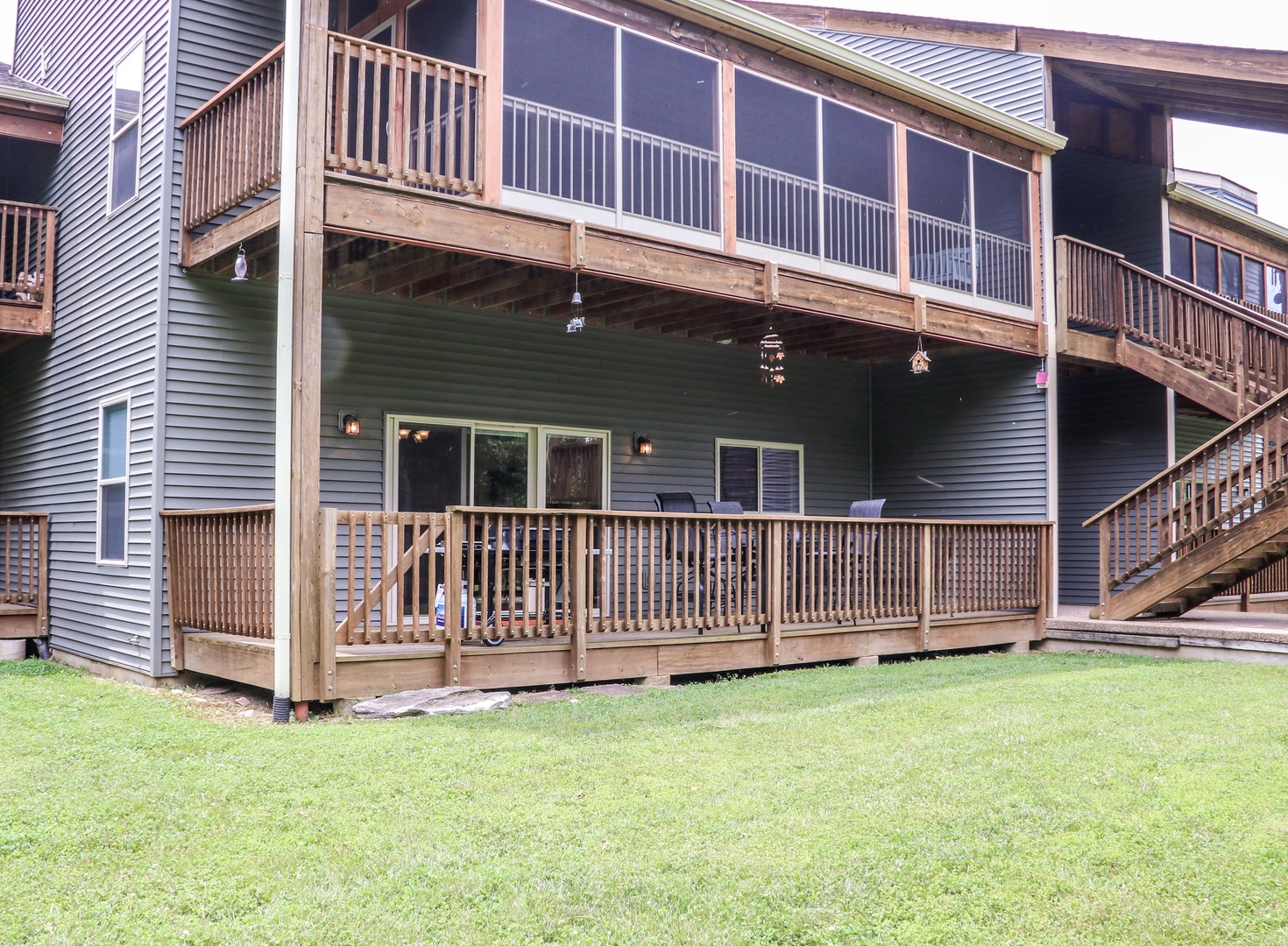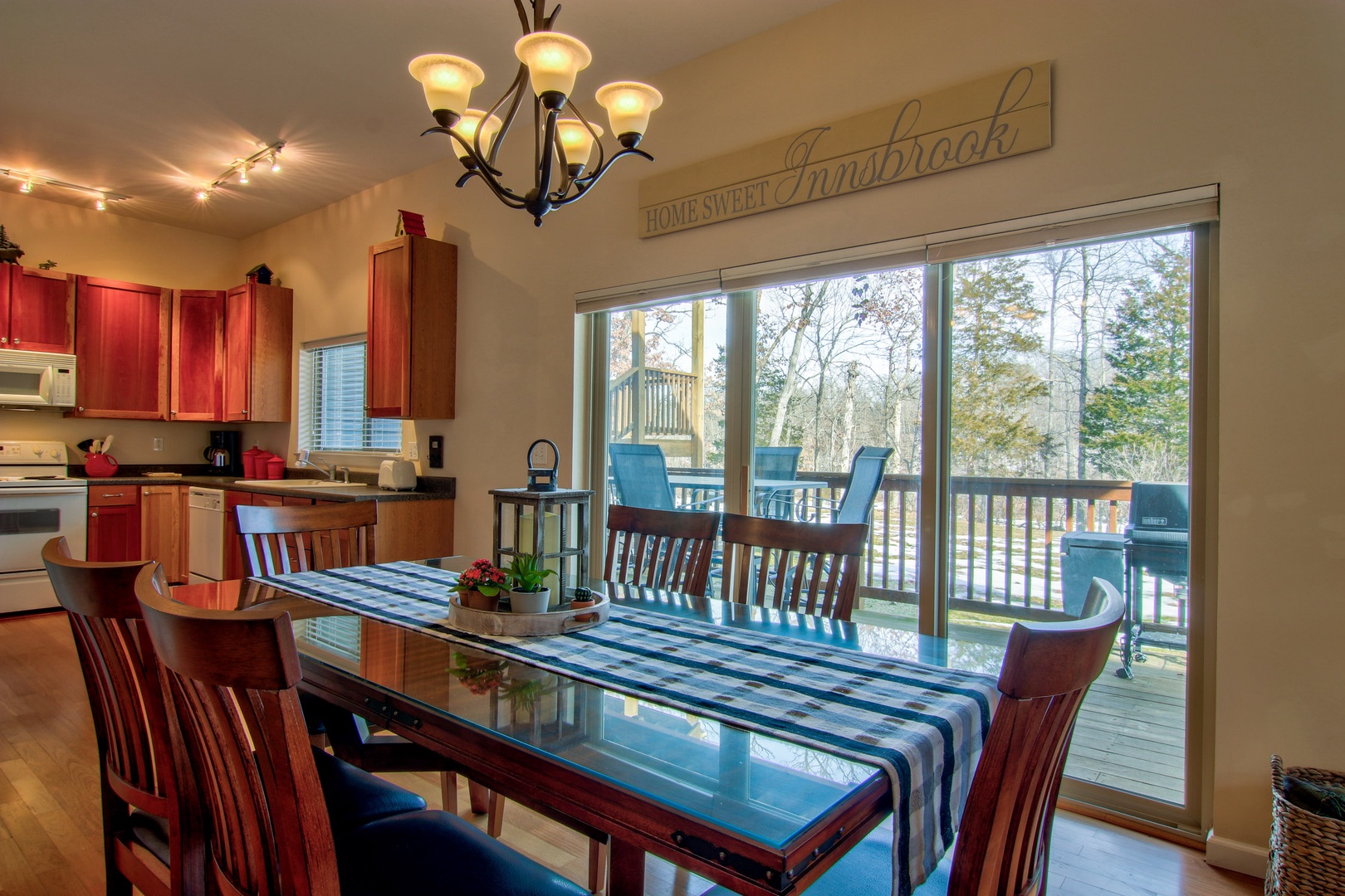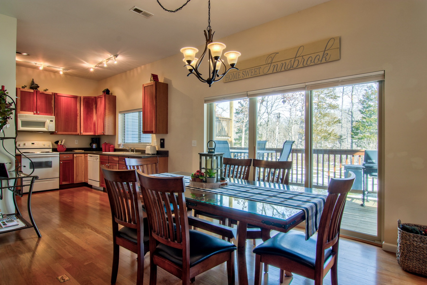 This condo is ideal for a small family or group, featuring a primary bedroom and private, handicap accessible primary bathroom, a second bedroom with a queen-sized bed and one set of bunk beds, a second full bathroom, an open living area with luxury furniture and spacious dining room table, new flat screen TVs, and a fully equipped kitchen for your convenience. From the dining area, step out onto the private deck and observe the sparkling waters of Lake Aspen below.